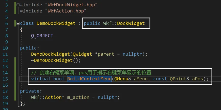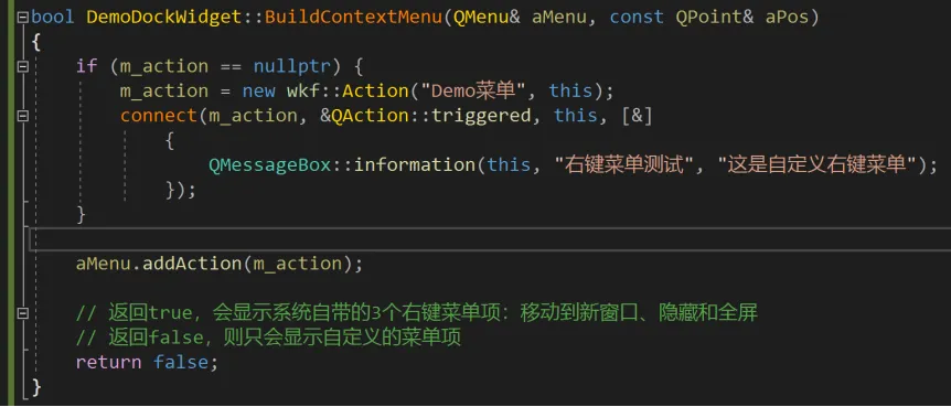这个比较简单,与创建DockWidget是有关系的,因为右键菜单都是在某一个DockWidget中右键出现的,需要注意的是要继承wkf::DockWidget并重载BuildContextMenu函数。