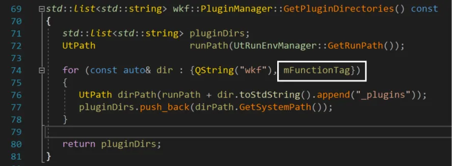 PluginManager使用这个参数在GetPluginDirectories方法中构建plugins目录,mFunctionTag就是创建PluginManager时传入的参数,也就是wkf::Environment::Create的第一个参数: