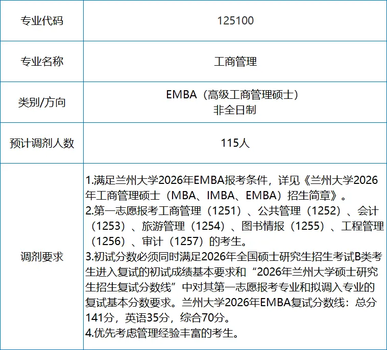 根据兰州大学2026年硕士研究生招生复试录取工作的相关要求,经管理学院研究生招生工作领导小组研究,兰州大学EMBA接受调剂情况如下,欢迎同学们调剂报考!