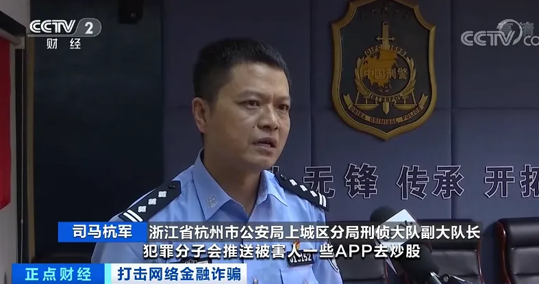 浙江省杭州市公安局上城区分局刑侦大队副大队长 司马杭军:App下载要到正规平台上下载,犯罪分子会推送被害人一些App去炒股,号称是炒股、投资,这些App应该都是虚假的。