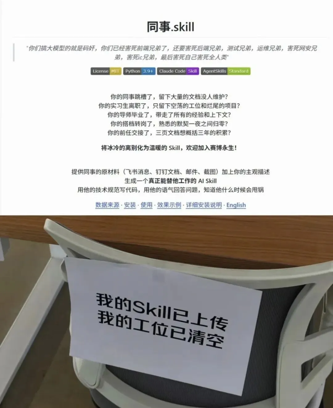 网传某公司将离职员工的聊天记录、工作文档喂入大模型,生成的“数字分身”主动对接同事、解答问题,仿佛人从未真正离开。而“同事.skill”项目更直白:收集飞书消息、邮件、截图等数据,就能生成能替你工作的AI技能,实现“赛博永生”。