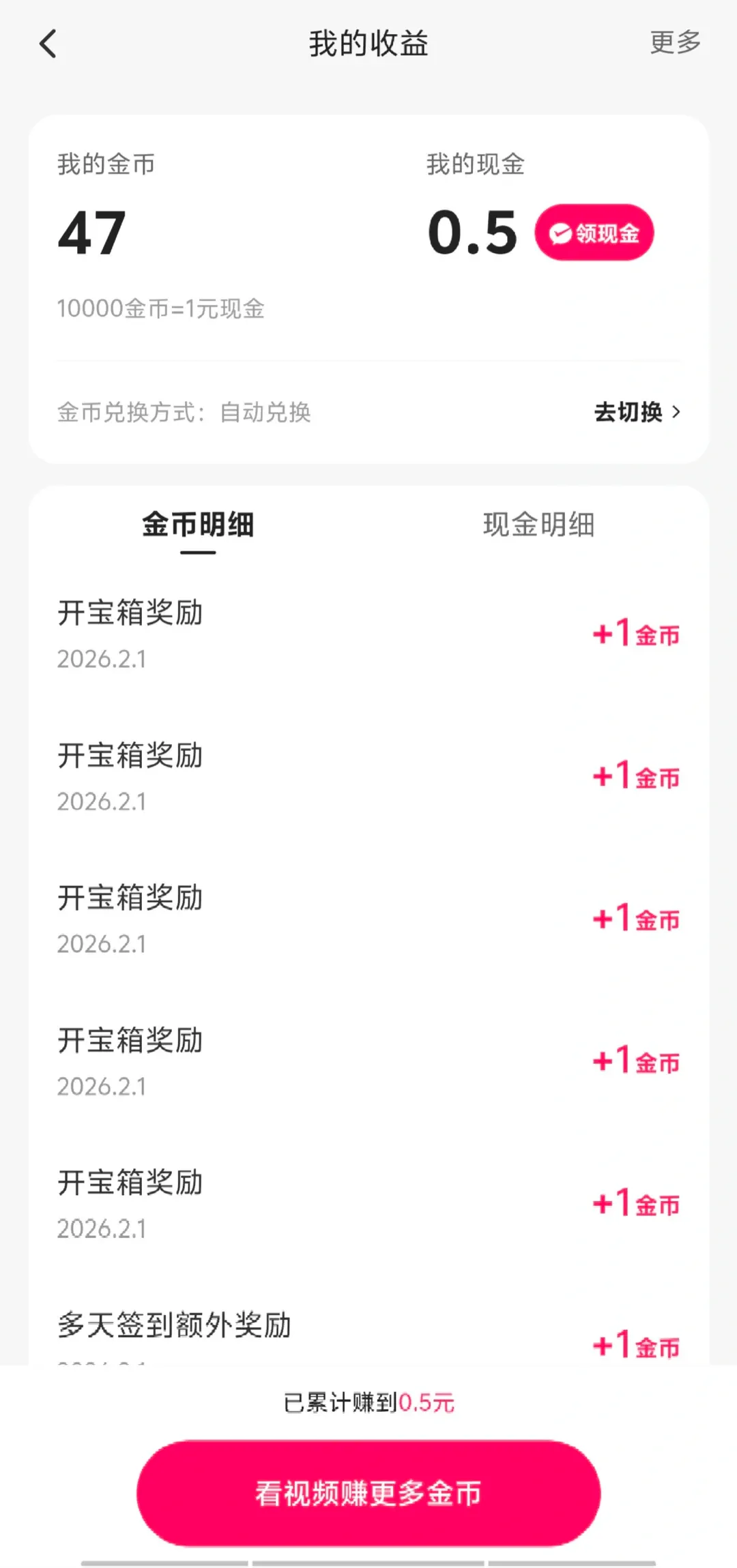 除了签到,还有:开宝箱(每10分钟开一次,金币累积)、看广告视频、邀请好友、走路赚金币。宝箱可以反复开,一天多薅几毛。