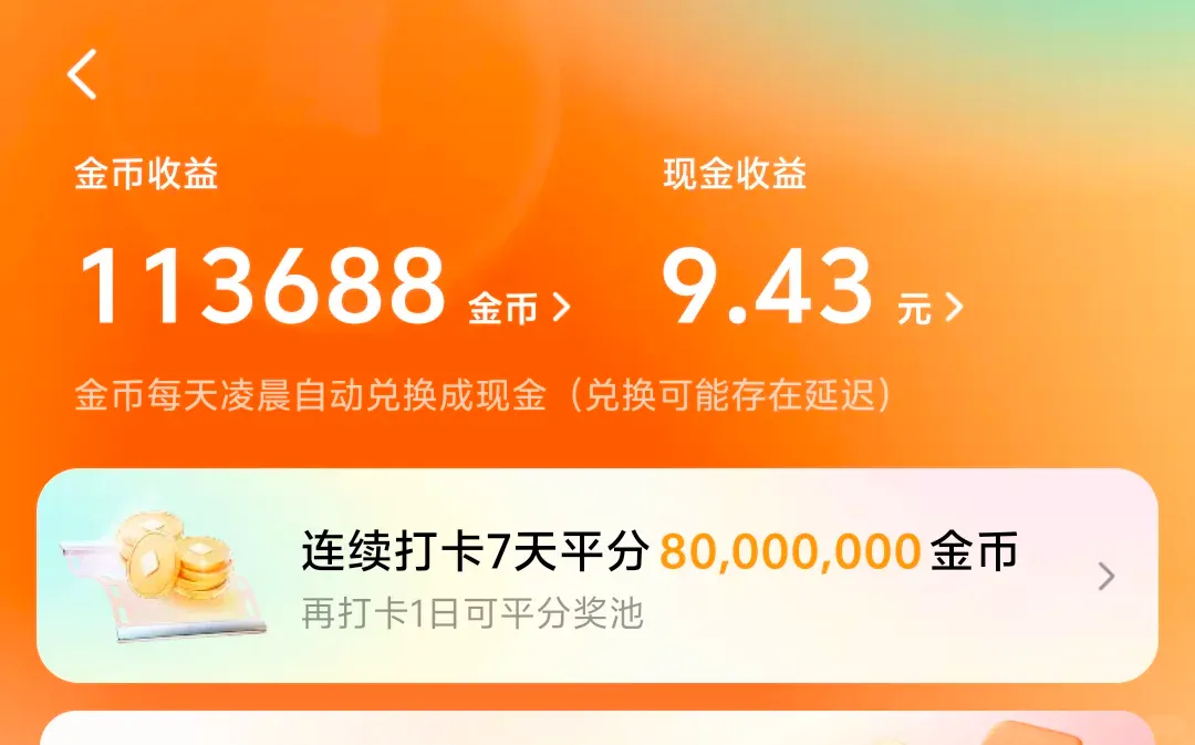 签到、吃饭打卡、走路赚钱(授权步数,每天领金币)、开宝箱、大额专区(做任务领大额金币)。早晚时段金币暴涨,记得蹲。