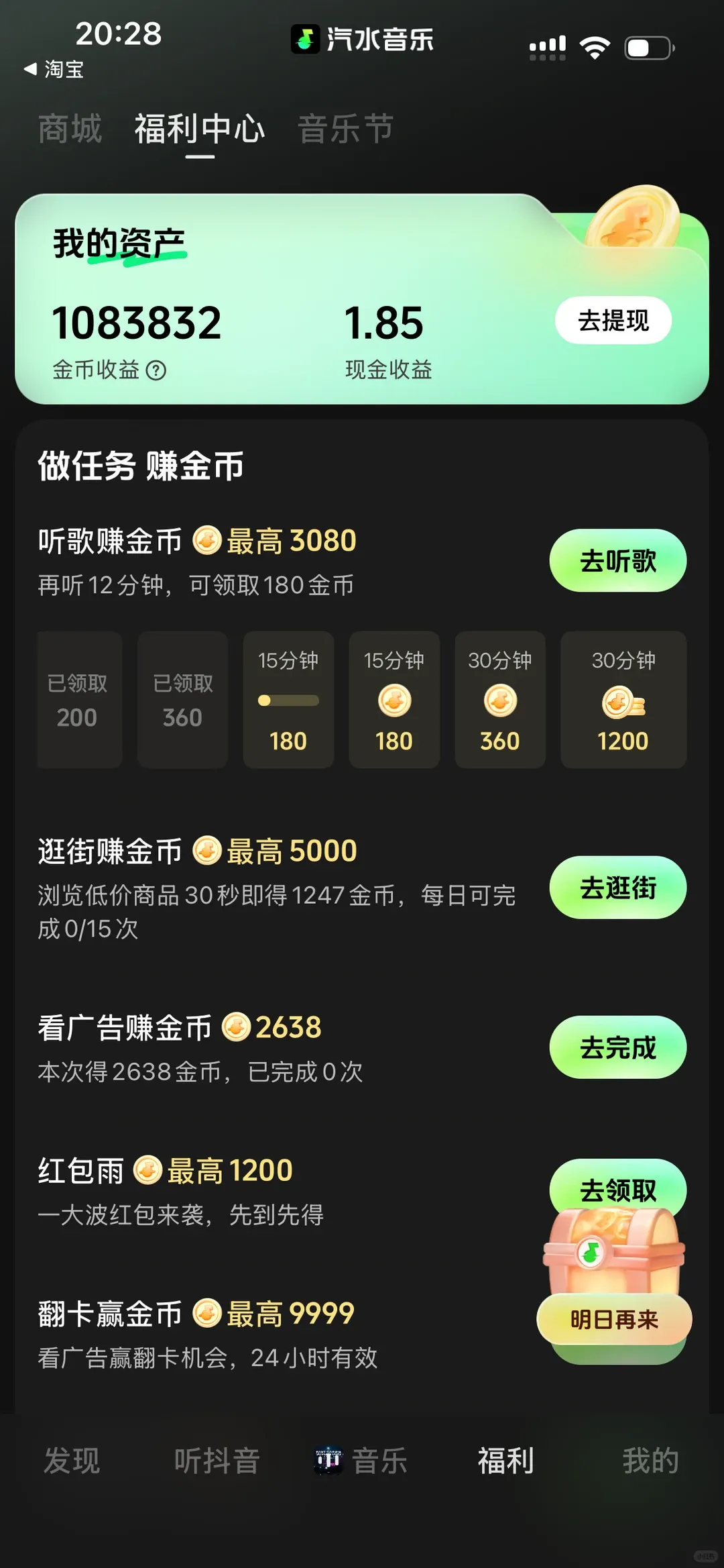 签到、翻卡赢金币、听歌领金币、看广告红包、开宝箱。通勤路上挂着听,金币自动涨。