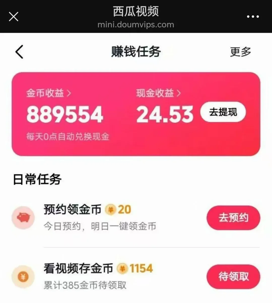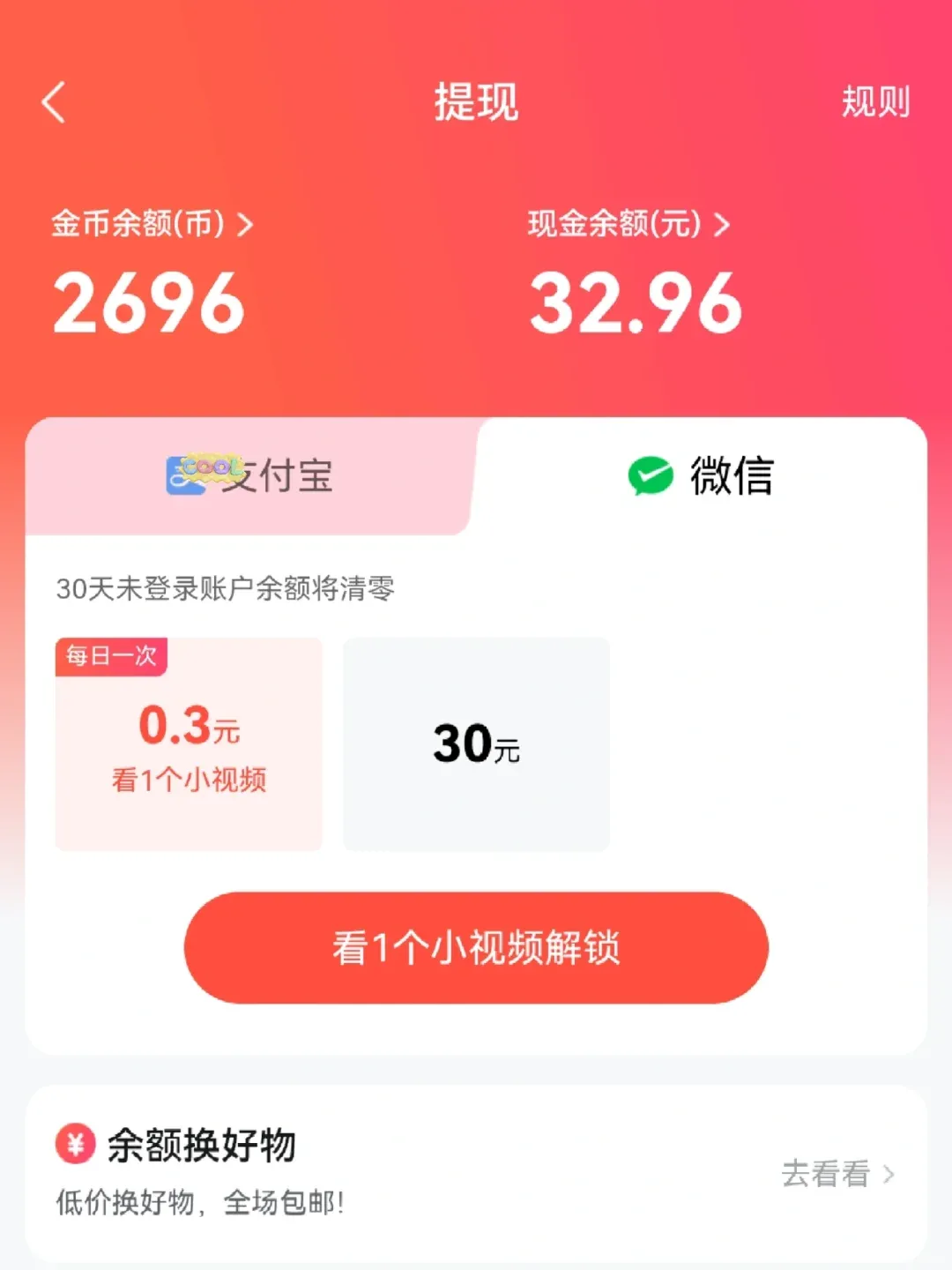 这几个APP的兑换规则基本一致:33000金币 = 1元,0.3元就能提现,而且秒到账!每天花半小时,稳赚几块钱。