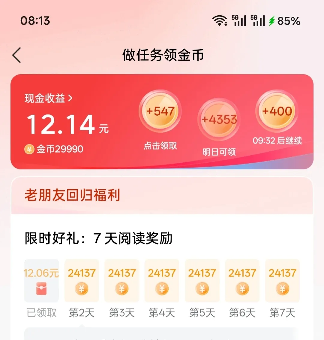 除了签到、宝箱,还有:“吃饭补贴”(饭点领金币)、抽奖(每日免费抽)、听书/阅读时长奖励。晚上听书时挂着,金币给得多。