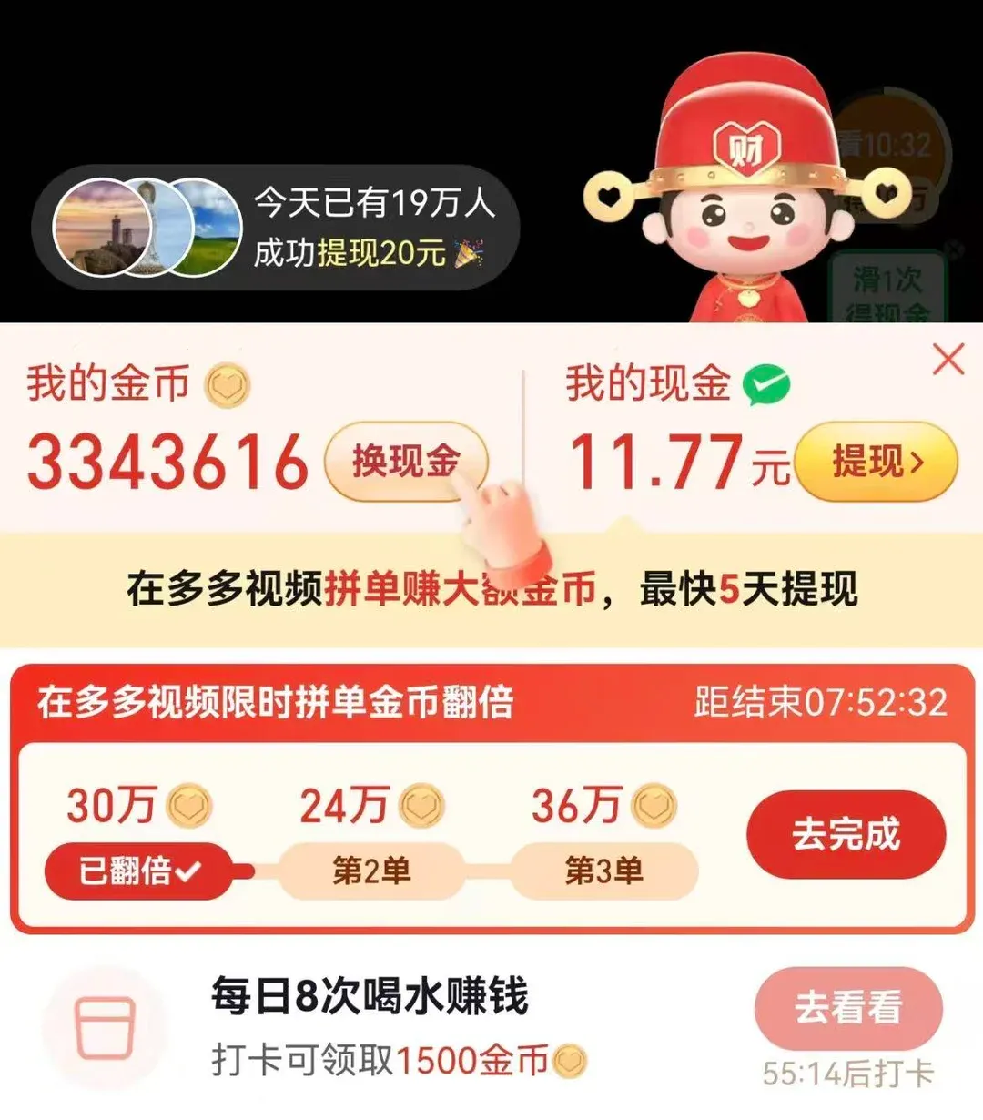签到、多多视频(刷短视频给金币)、多多果园(浇水种树换实物或红包)。果园每天花几分钟,能换水果或几块钱。