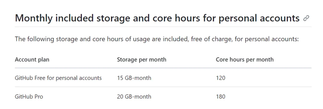 github的codespaces每月为免费用户提供了1核心120小时的机时,如果要使用多线程,就相应的相除就可以了,比如要使用4核心,那么对应的时间就是30小时。然后是15GB磁盘空间,其实已经足够用了。