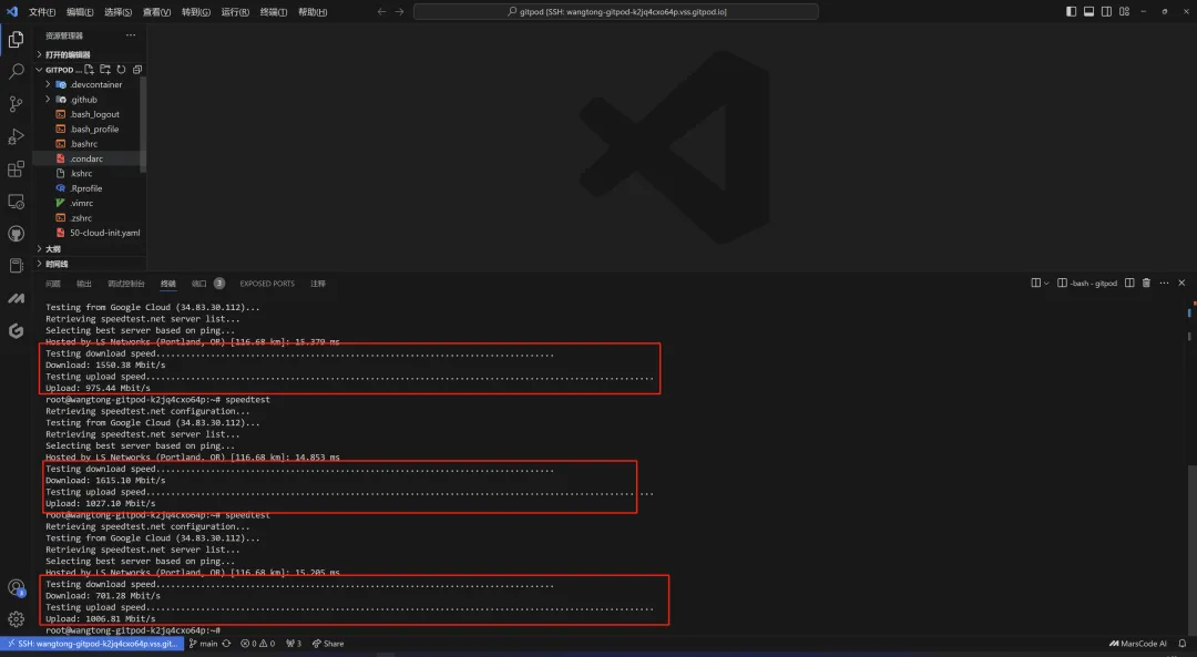 codespace使用微软Azure云,gitpod默认打开的是google云,这两个平台的网速都超快。使用speedtest测试,网速都在1.5G左右。