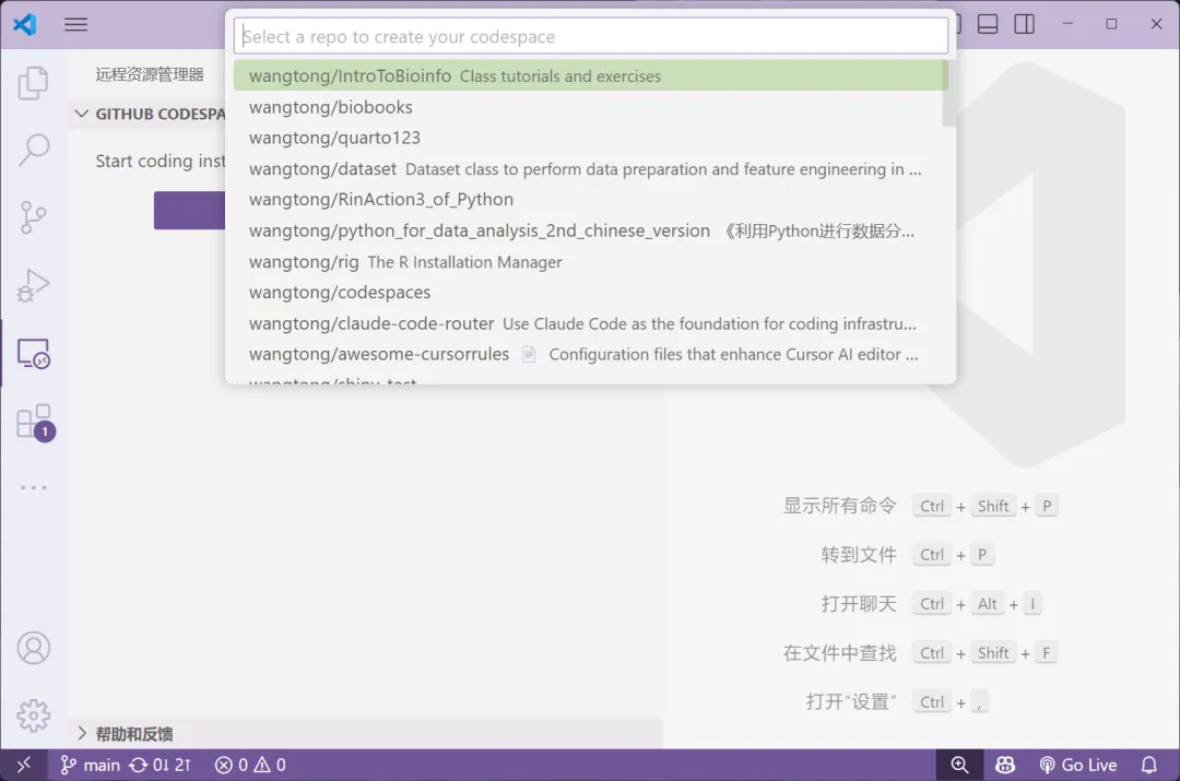 codespaces会为github中的代码创建一个docker项目,默认是一个ubuntu操作系统,我们可以使用这个linux系统来使用各种AI工具。