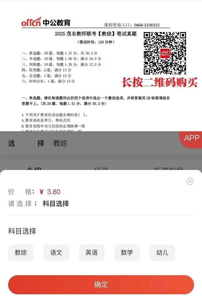 2026茂名教师招聘笔试zhen题(电子版) 2026茂名教师联考预计6月份出招聘公告笔试内容根据地区和学科不同,考教综或者学科专业知识 去年具体为:👇 ①[化州、电白】考学科知识 ②[市直属、茂南区、滨海、高州、信宜】语数英/物化生/政史地(考学科知识),其他岗位(考教综) 备考茂名教师的宝子们,点击蓝字购买25年→茂名教师笔试zhen试题,提前熟知考情、考试内容和方向吧!! 可选不同学科:语文、数学、英语、幼儿、教综; 包含试题和参考答案 🎨试题为去年25年笔试试题;电子版,可下载打印:扫图中二维码或点击蓝字可跳转购买茂名教师笔试zhen试题