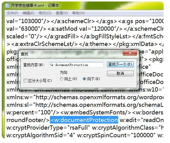 Ctrl + F键,输入<w:documentProtection,点击查找下一个。