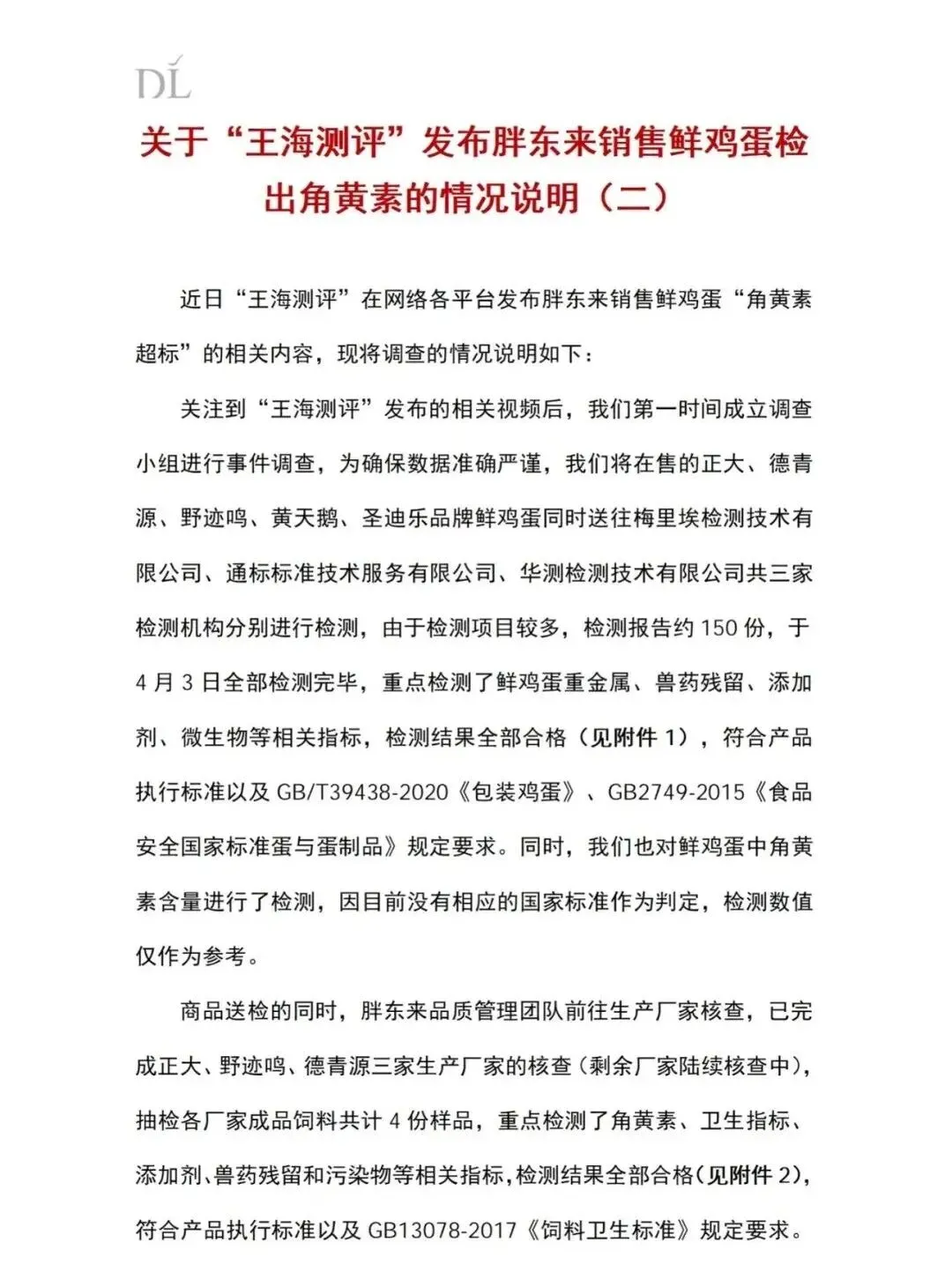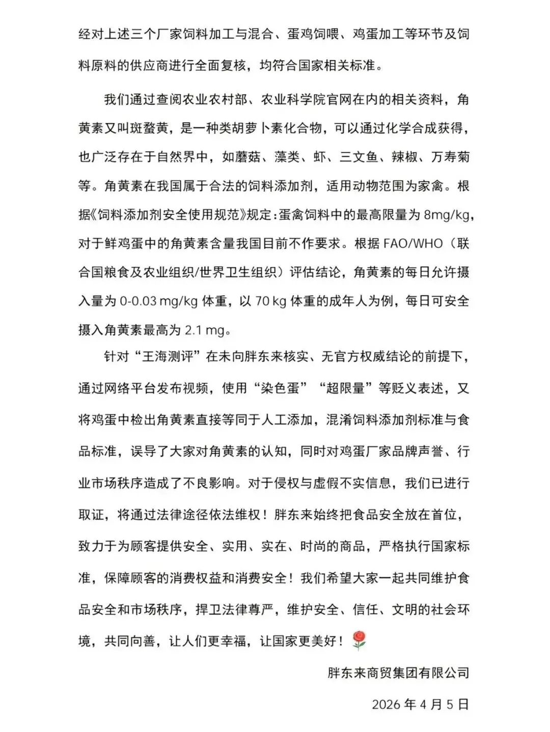情况说明称,针对“王海测评”在未向胖东来核实、无官方权威结论的前提下,通过网络平台发布视频,使用“染色蛋”“超限量”等贬义表述,又将鸡蛋中检出角黄素直接等同于人工添加,混淆饲料添加剂标准与食品标准,误导了大家对角黄素的认知,同时对鸡蛋厂家品牌声誉、行业市场秩序造成了不良影响。对于侵权与虚假不实信息,胖东来已进行取证,将通过法律途径依法维权。