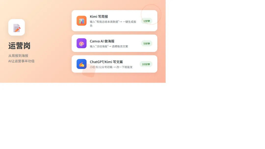运营的工作繁杂琐碎,但很多都是重复性劳动。AI能帮你快速完成这些”苦力活”,让你有更多时间思考策略。