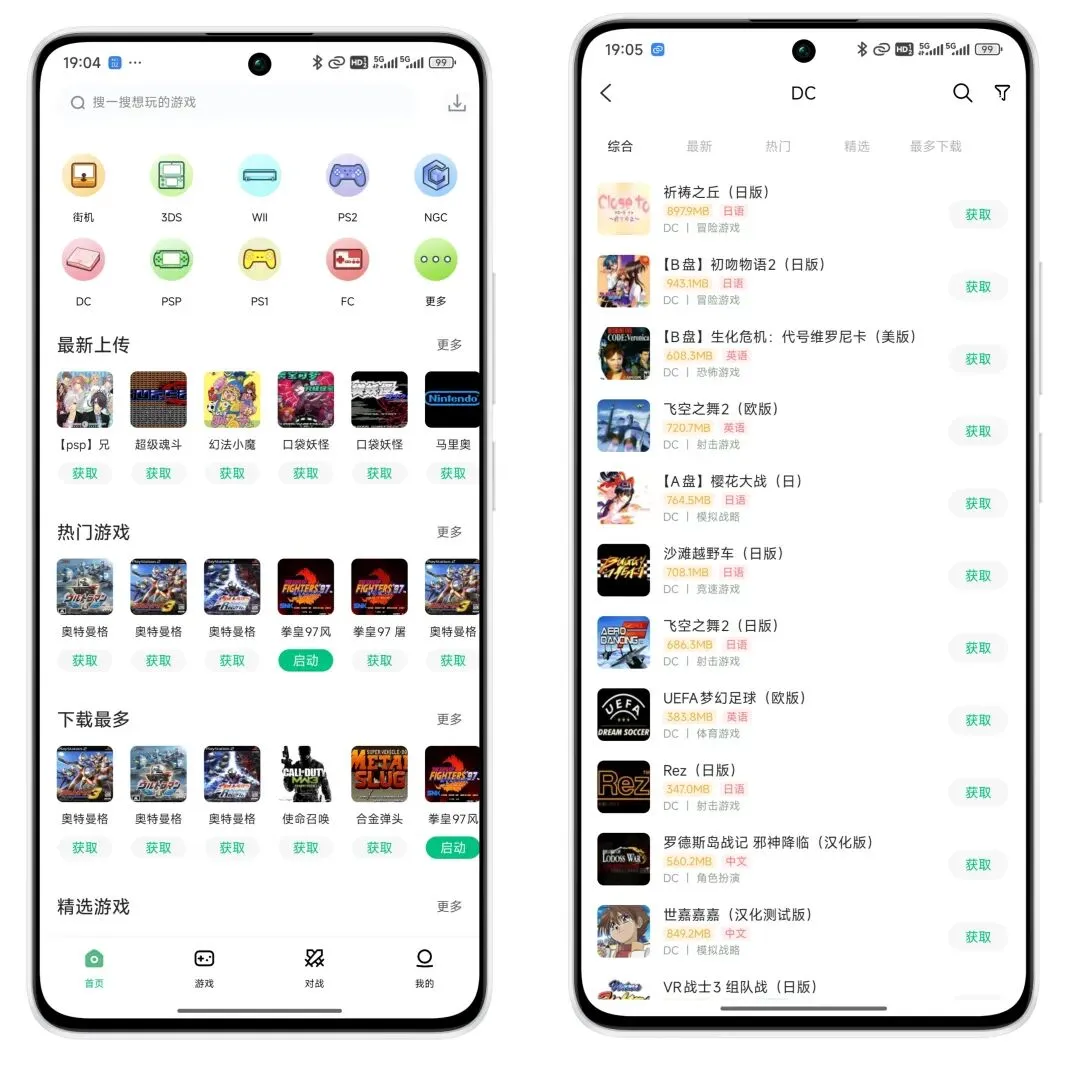 首页点击更多,可以查看支持游戏的所有分类,有街机、3DS、WII、NGC、DC、PSP、FC、PS1、WSC等19种。