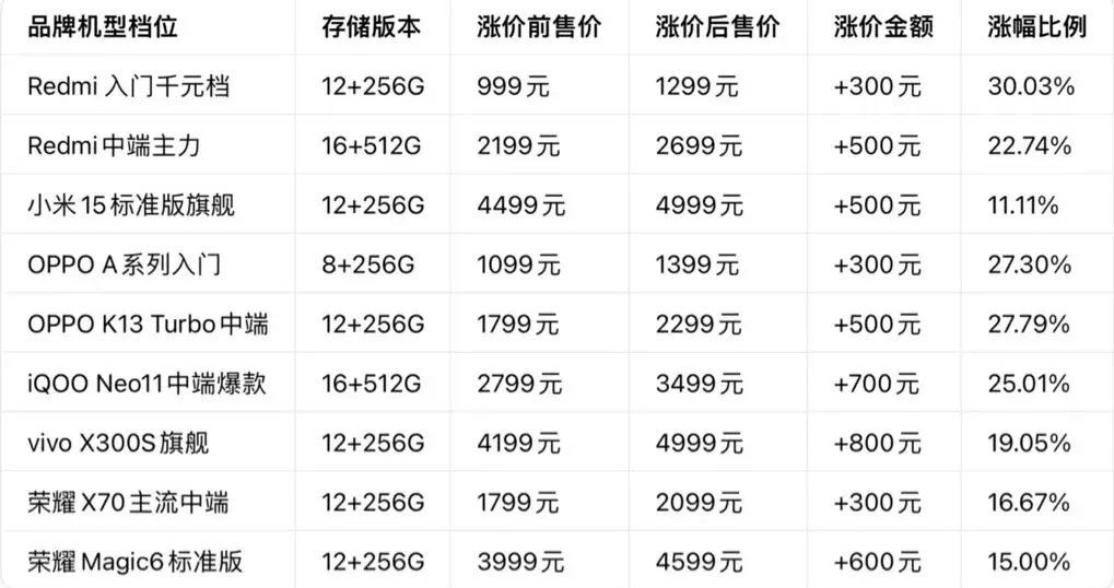 • 时间⌛️:2026年3月开始,OPPO、vivo、小米、荣耀等陆续官宣调价。