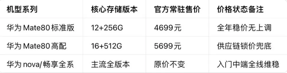 二、华为全系机型价格锁定表(无涨价)
