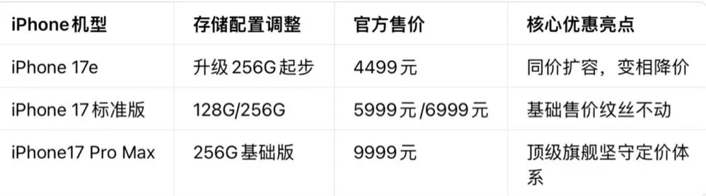 • 策略:iPhone 17e起步存储从128GB→256GB,价格不变,变相降价。