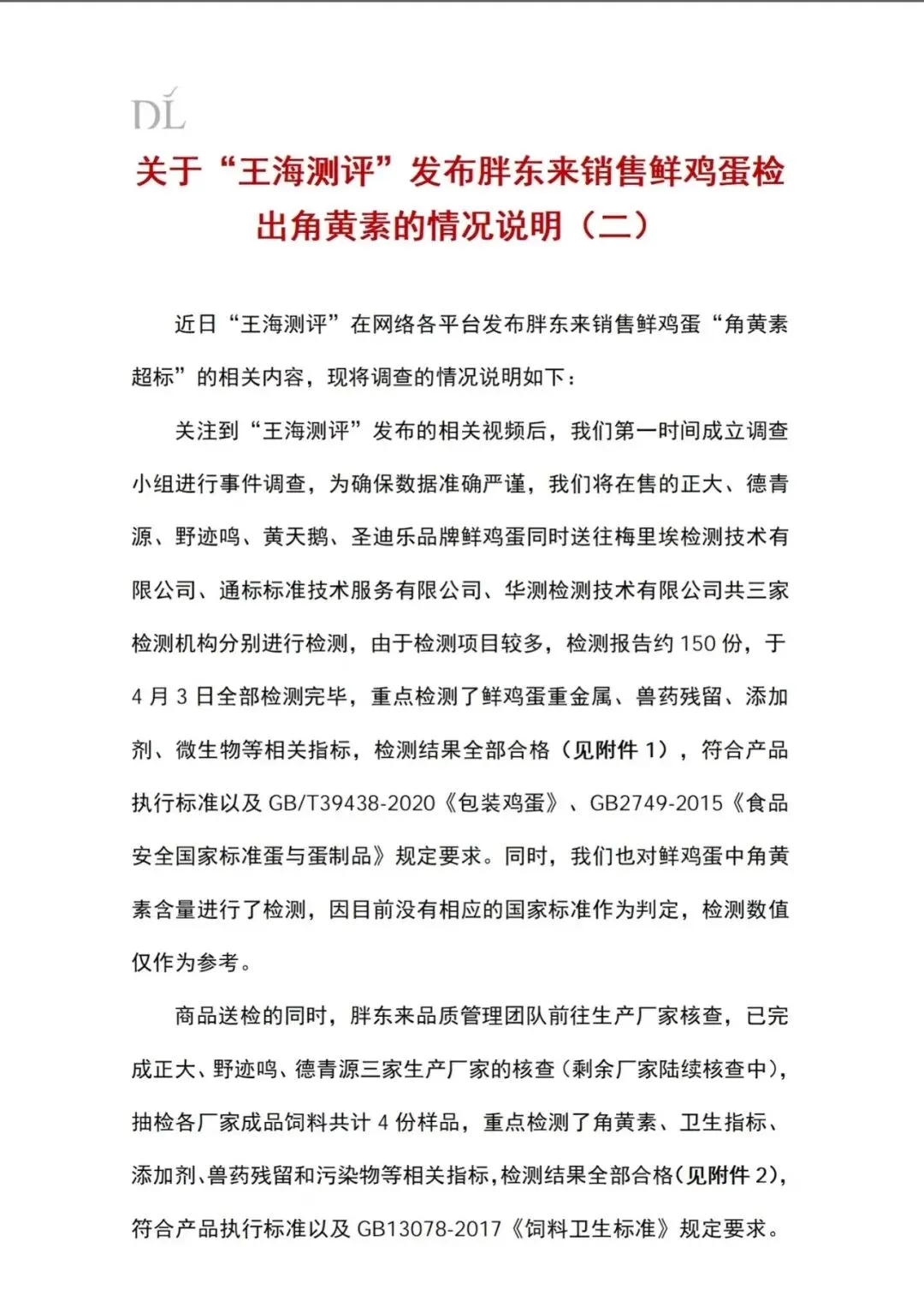 4月5日,胖东来官方账号发布关于“王海测评”发布胖东来销售鲜鸡蛋检出黄角素的详细情况说明。