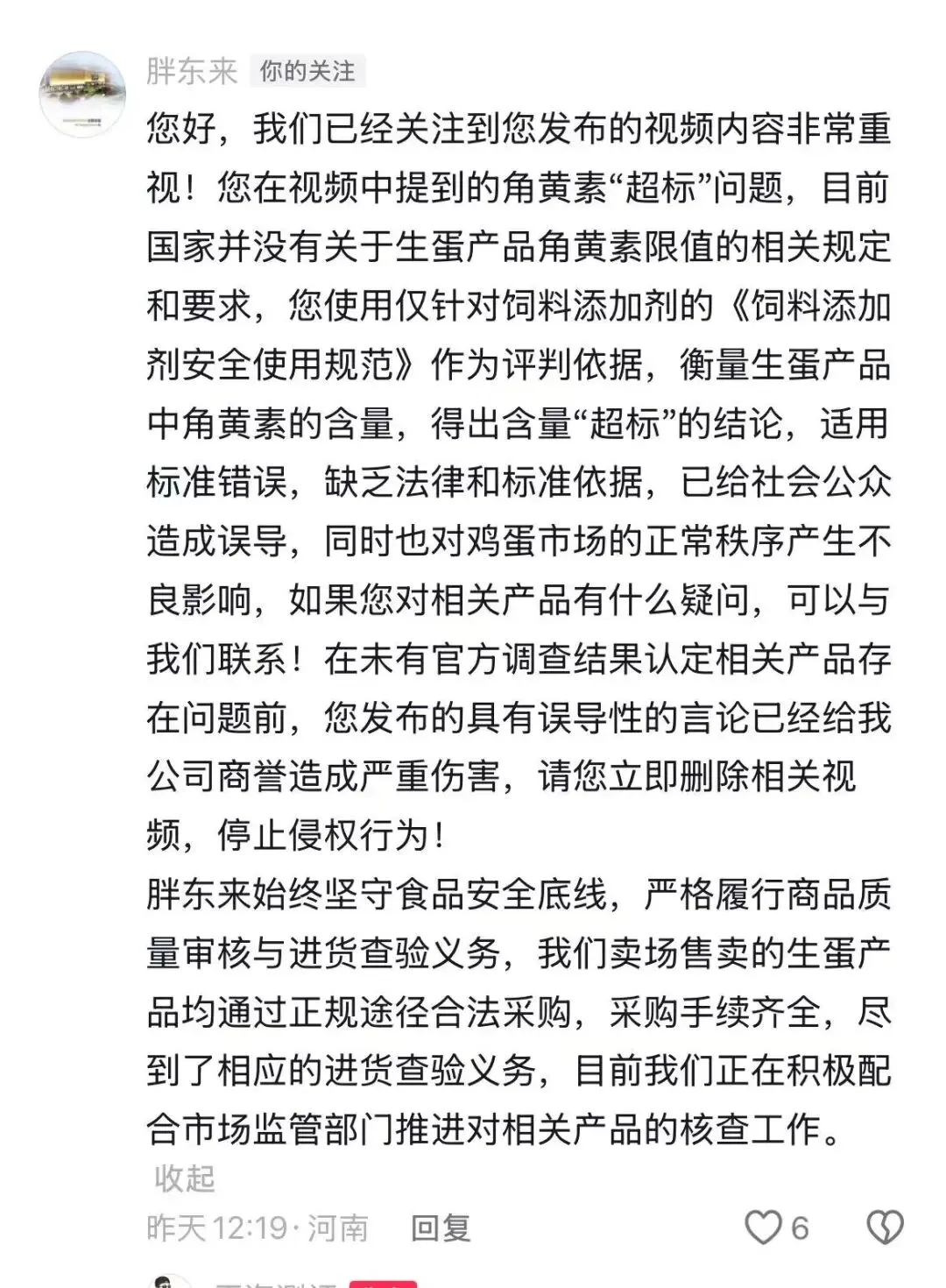 记者注意到,胖东来在其评论区进行了回复,称视频中提到的角黄素“超标”问题,目前国家并没有关于生蛋产品角黄素限值的相关规定和要求,博主使用仅针对饲料添加剂的《饲料添加剂安全使用规范》作为评判依据,衡量生蛋产品中角黄素的含量,得出含量“超标”的结论,适用标准错误,缺乏法律和标准依据,已给社会公众造成误导,同时也对鸡蛋市场的正常秩序产生不良影响,请立即停止侵权行为。