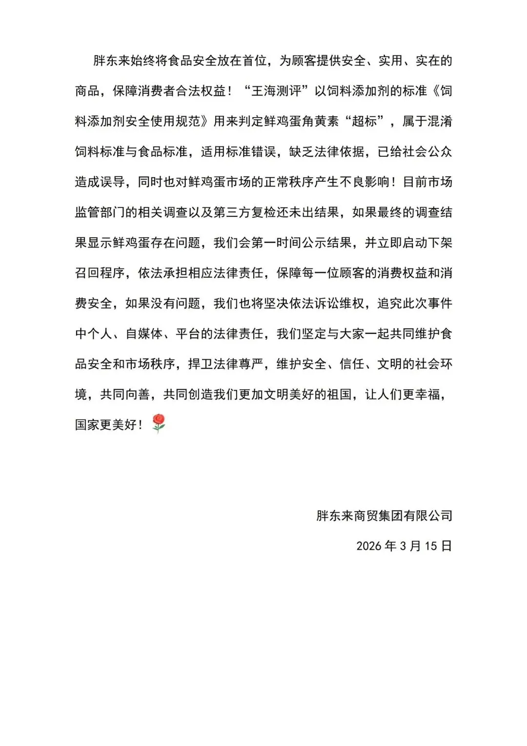 胖东来在声明中指责“王海测评”在未向公司核实、也无官方结论的情况下,使用“染色蛋”、“超限量”等误导性表述发布视频,混淆了饲料添加剂标准与食品标准,不仅误导了公众,也对相关品牌及市场秩序造成了不良影响。对此,胖东来表示已对相关侵权与不实信息进行取证,并将通过法律途径维权。
