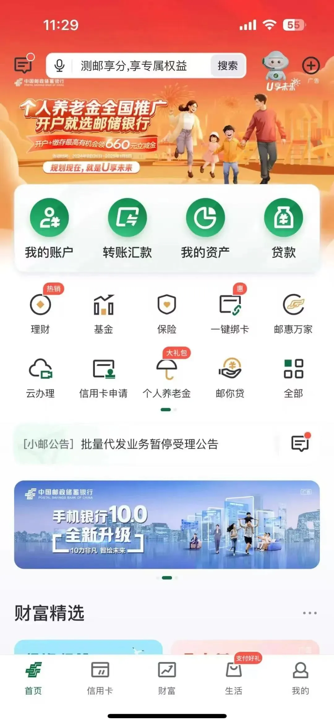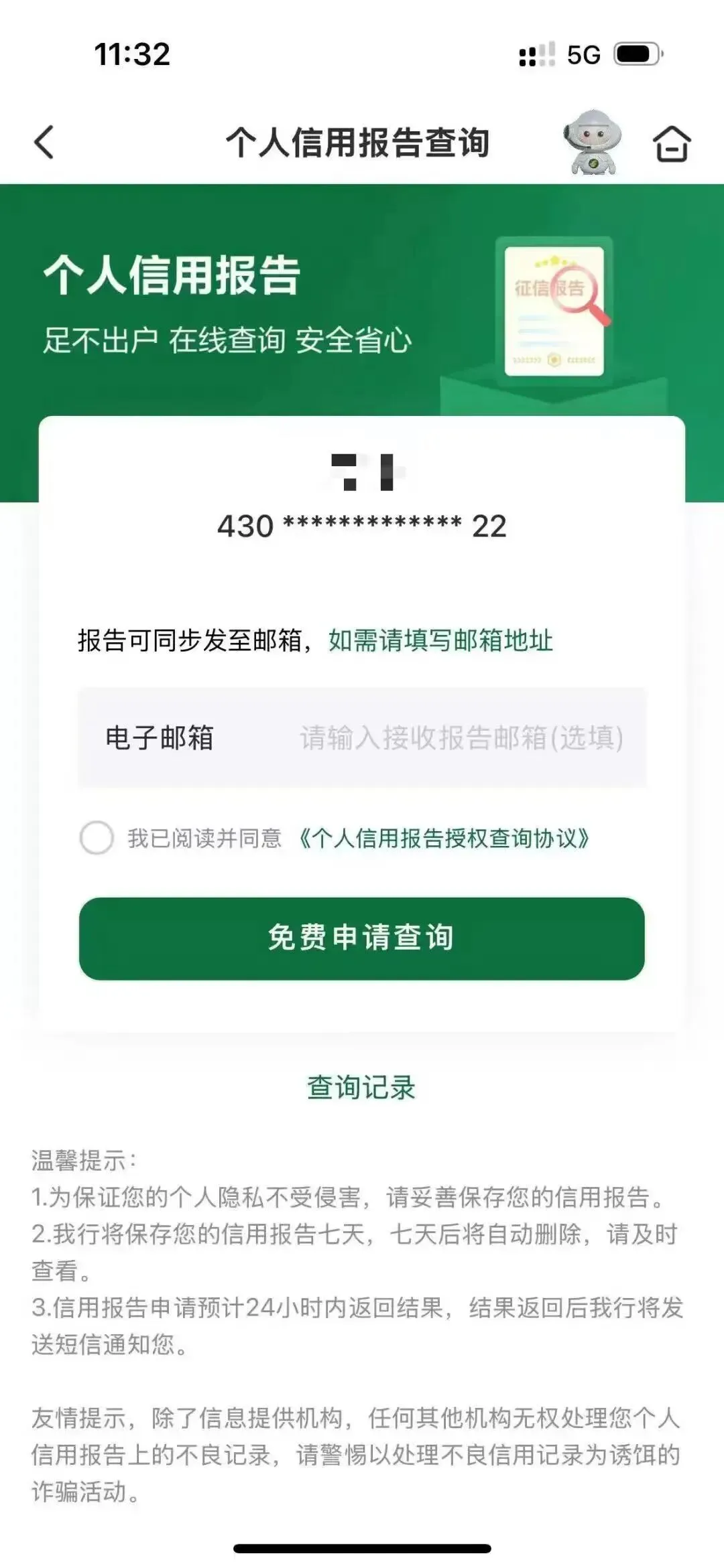 【中国邮政储蓄银行】手机app个人征信,如何在线查询? 建议收藏 1、登录邮储银行手机银行,点击首页。 2、搜索栏输入“个人征信报告”。 3、输入个人邮箱,点击免费获取。 分割线 真正的价值,在于当你遇到难题时,我能刚好拿出那个“最优解”。 不想错过每一个与高手同行的机会,如果你也对金融、融资感兴趣,欢迎扫码/搜索添加我的微信,我们慢慢聊。