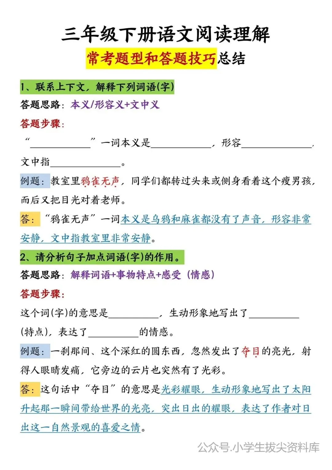 三年级阅读理解万能公式/电子版可打印