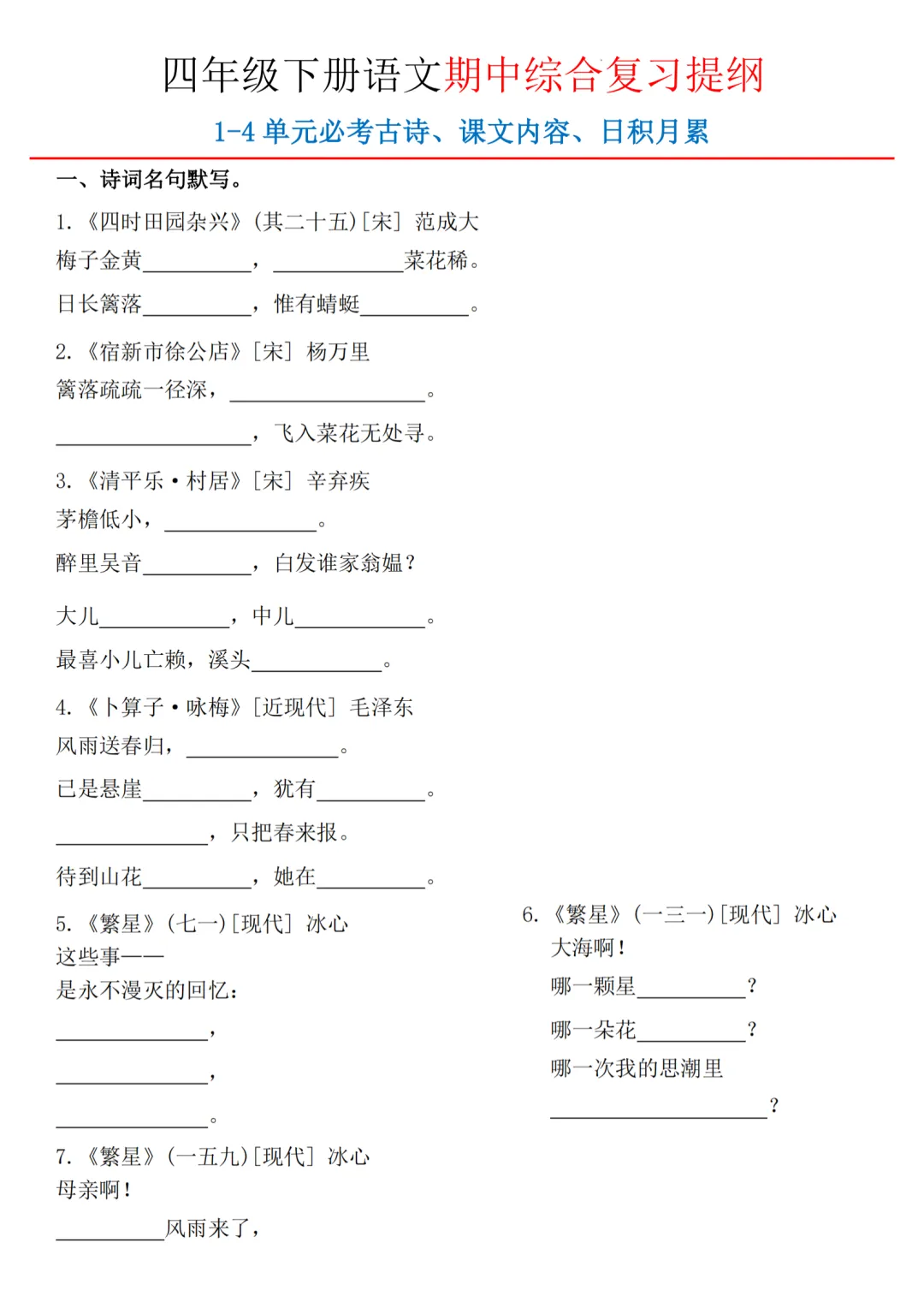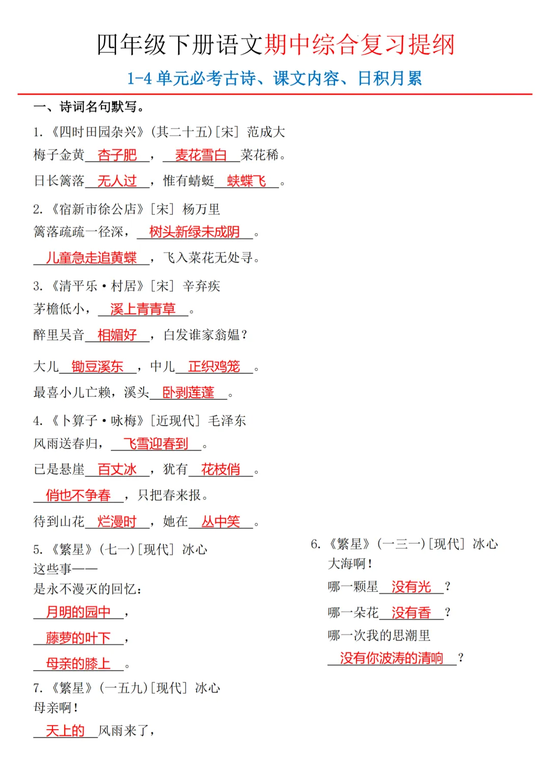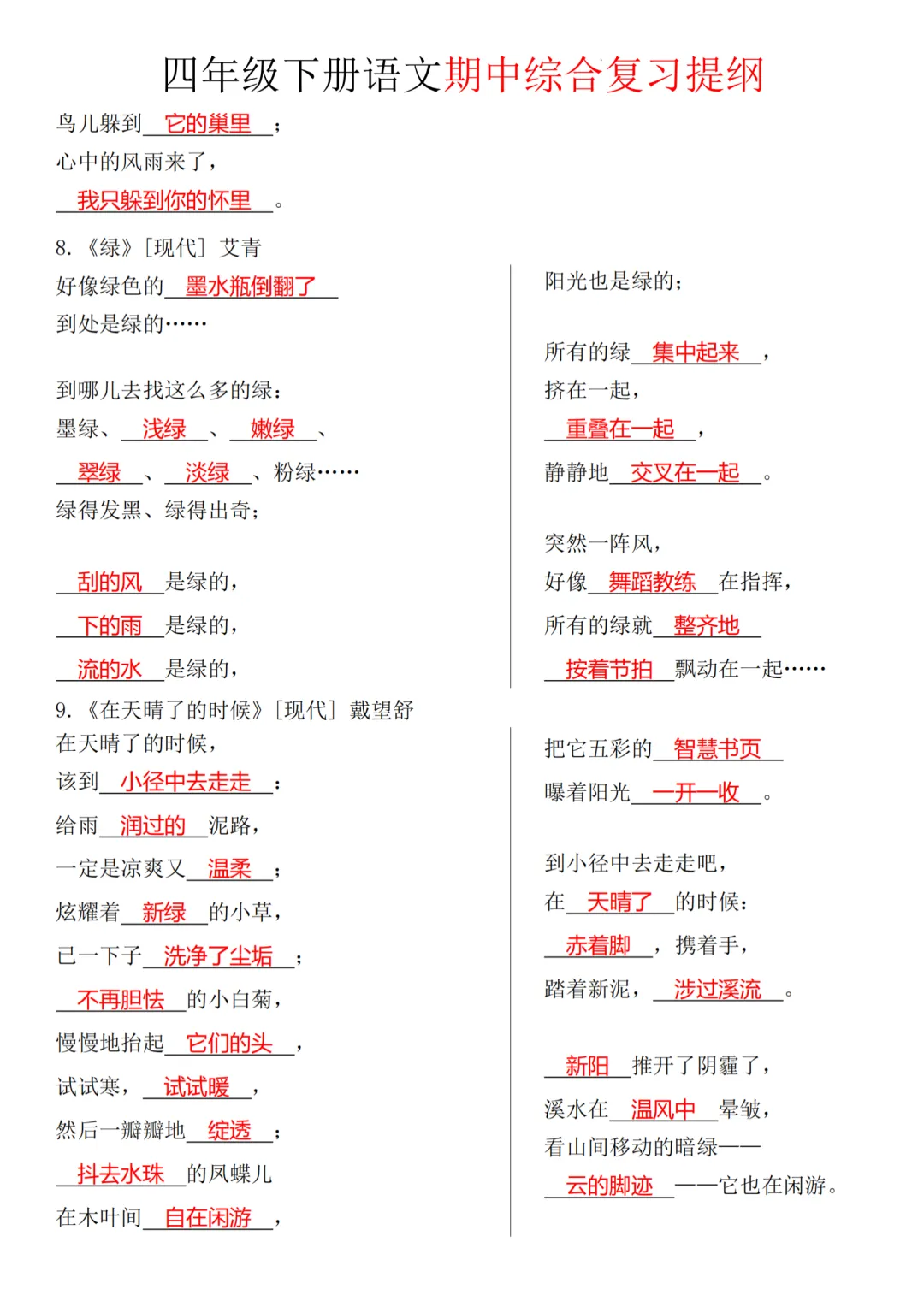 可打印!四年级下册语文期中复综合复习提纲,课文重点全覆盖