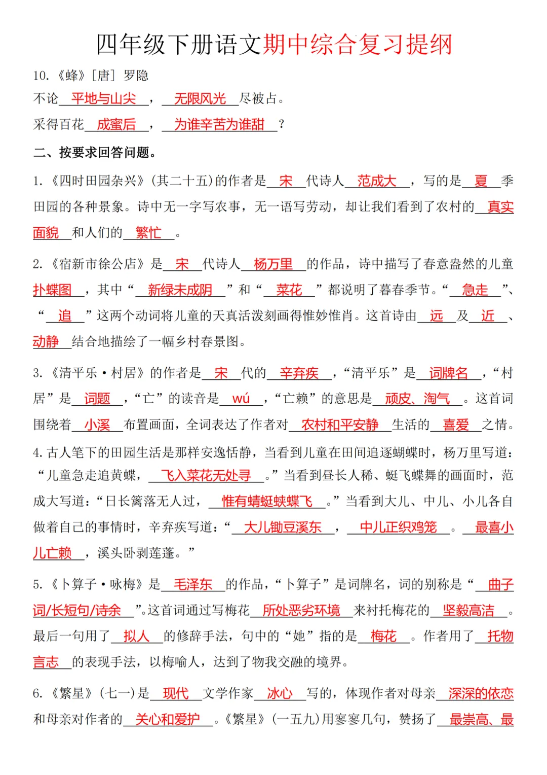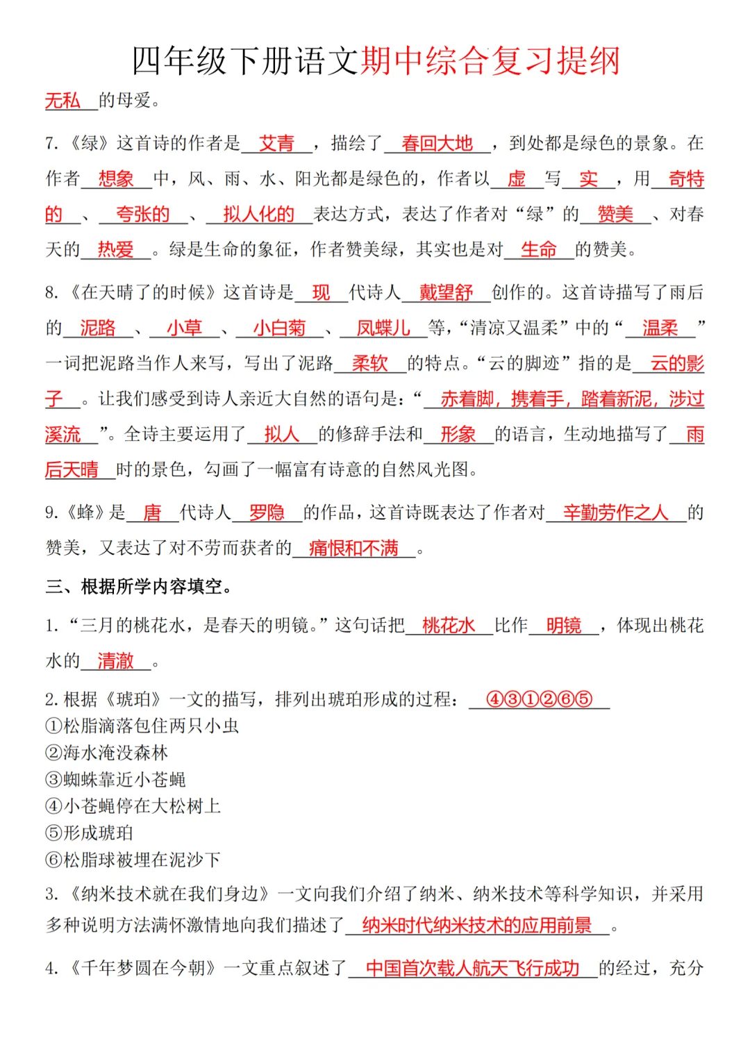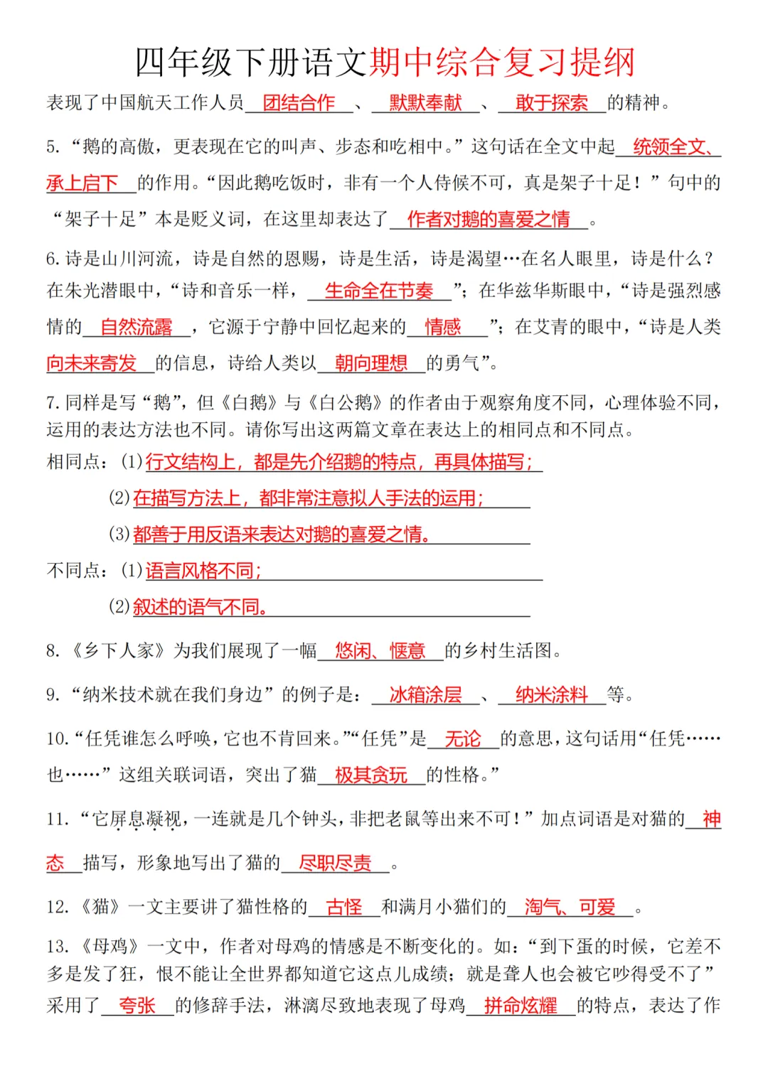 可打印!四年级下册语文期中复综合复习提纲,课文重点全覆盖