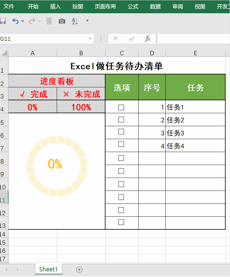 A4单元格中的公式解释:因为C4和C13单元格均链接了复选框的属性,根据复选框被选中与否,对应单元格中将会显示TRUE或FALSE。所以先用COUNTIF(C4:C13,TRUE)统计含有数据TRUE的单元格个数。再用COUNTA(C4:C13)统计非空单元格的个数,两数一除就得出了完成率
