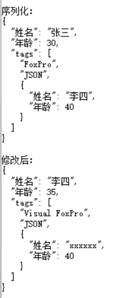 ClearSet Classlib To JSONHelper.VCXLocal loJSONHelper As JSONHelper Of JSONHelper.VCXLocal loRoot, loArrm.loJSONHelper = Createobject("JSONHelper")m.loRoot = m.loJSONHelper.Createobject()m.loRoot._set([姓名], "张三")m.loRoot._set([年龄], 30)m.loArr = m.loJSONHelper.CreateArray()m.loArr._push("FoxPro")m.loArr._push("JSON")m.loRoot1 = m.loJSONHelper.Createobject()m.loRoot1._set([姓名], "李四")m.loRoot1._set([年龄], 40)m.loArr._push(m.loRoot1)m.loRoot._set([tags], m.loArr)? "序列化:"? m.loJSONHelper.stringify(loRoot, .T.)?m.loRoot.姓名 = [李四]m.loRoot.年龄 = 35m.loRoot.tags._set(0, "Visual FoxPro")m.loRoot.tags.item(2).姓名 = "xxxxxx"? "修改后:"? m.loJSONHelper.stringify(loRoot, .T.)