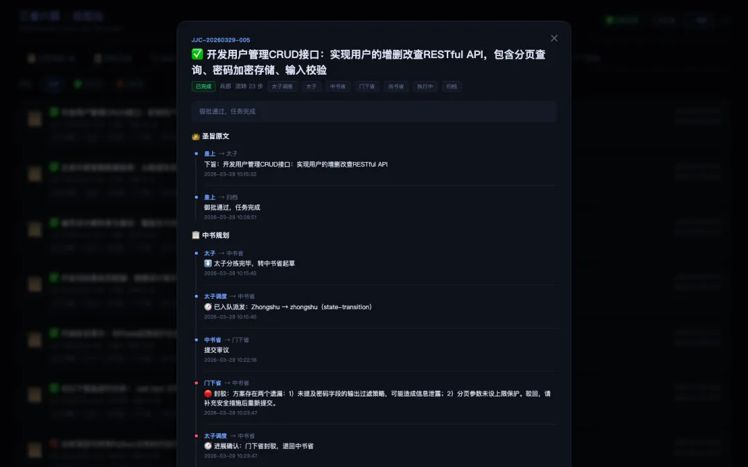 工部写文档 5 分钟不再卡住太子分拣消息。户部算完的数据写入任务记忆,兵部接手时自动读到。