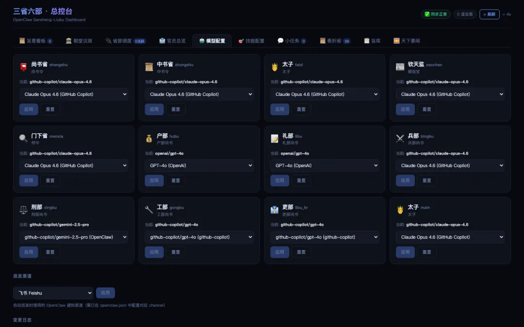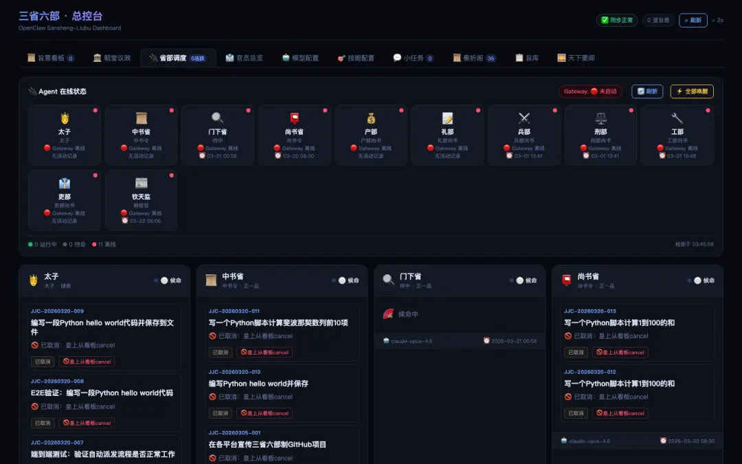 ▲ 省部调度总览——11 个 Agent 的在线状态和任务分配