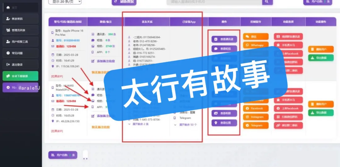 适合公司统一管理手机数据使用,不得违法使用。多次提醒,禁止非法使用,作者只提供分享研究!!!!开发仅供测试研究使用,请勿非法使用!!!!拥有自由操作度最好的后台,APP前端样式一键修改。去除过多授权提醒,提高用户信息获取率。优化业务系统后台管理员与代理的操作功能。后台可自行上传和修改APP背景图,无需重新打包APP。拥有四个APP前端模板,无需重新打包即可一键选择替换。APP各个参数自由修改,包括:名称、授权提示文字、登录后跳转网址等十多种参数修改。添加Tg机器人查询用户信息增加获取新用户时Tg机器人通知提醒。适合公司统一管理手机数据使用,不得违法使用。多次提醒,禁止非法使用,作者只提供分享研究!!!!