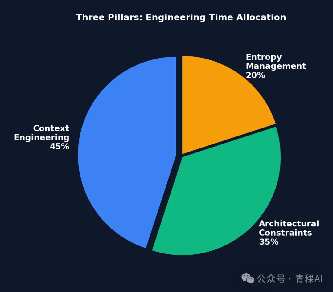 图 1-2: 三大支柱的工程时间分配 — Context Engineering 占据最大比例(45%),因为”Agent 看不到的信息等于不存在”;Architectural Constraints 次之(35%);Entropy Management 占 20% 但对长期稳定性至关重要。