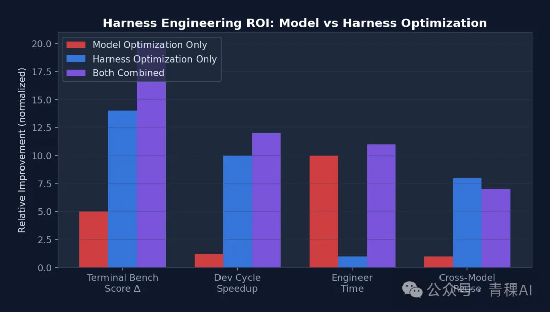 关键洞察:Harness 优化的投资回报率(ROI)远高于模型优化。一个精心设计的 CLAUDE.md 文件只需 30 分钟,但可以将 Agent 在特定项目上的表现提升 20-40%。相比之下,模型微调需要数周时间和大量计算资源,且只对特定任务有效。