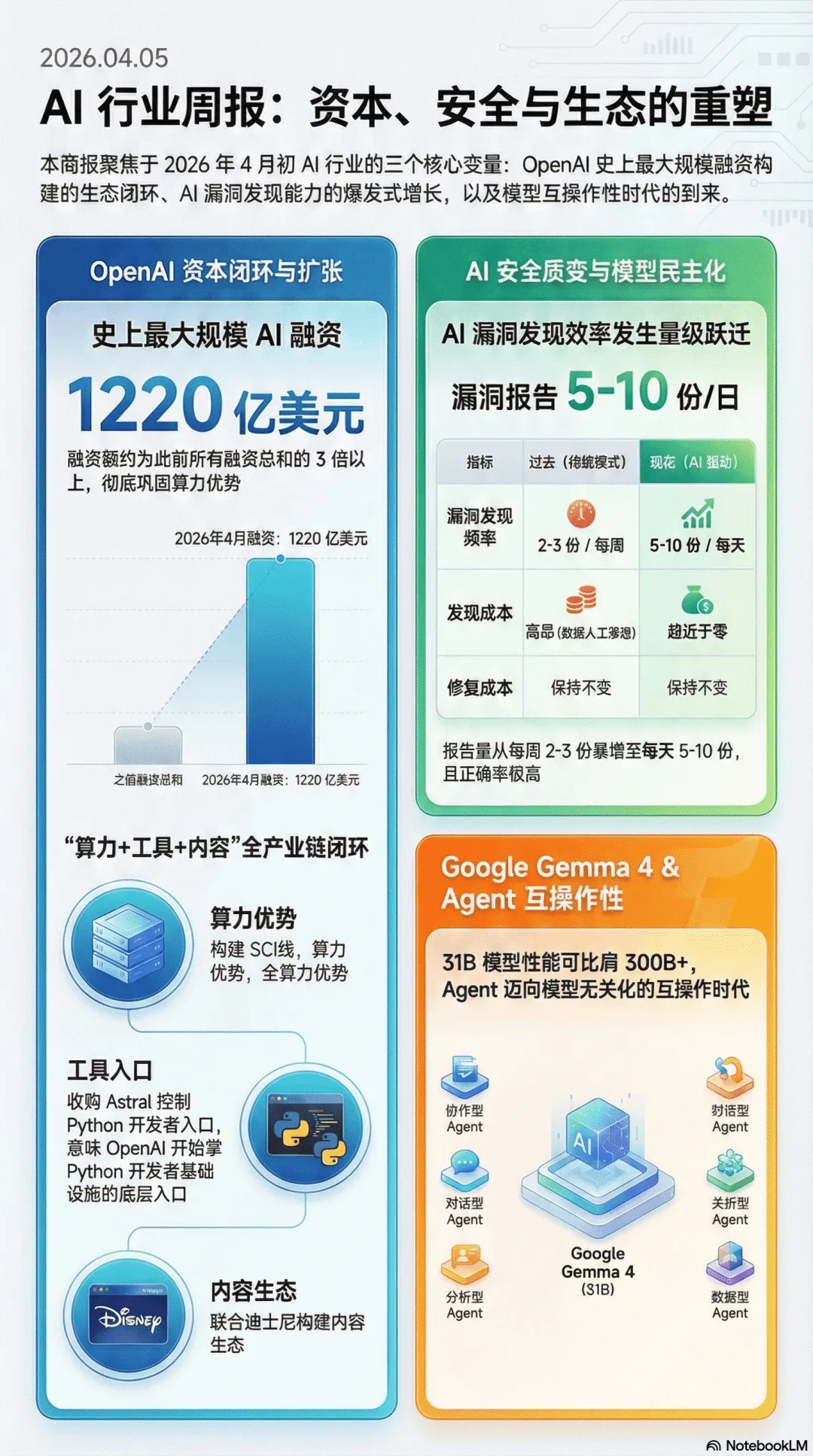 Google 发布 Gemma 4(首次 Apache 2.0),31B 性能约等于 300B+ 模型,4B 可手机运行。OpenAI 官方发布 Codex-Claude Code 桥接插件⭐11765,Claude Code 源码泄露后衍生项目爆发。模型民主化加速,Agent 从竞争走向互操作,OpenClaude⭐15444 兼容 200+ 模型确认模型无关化趋势。