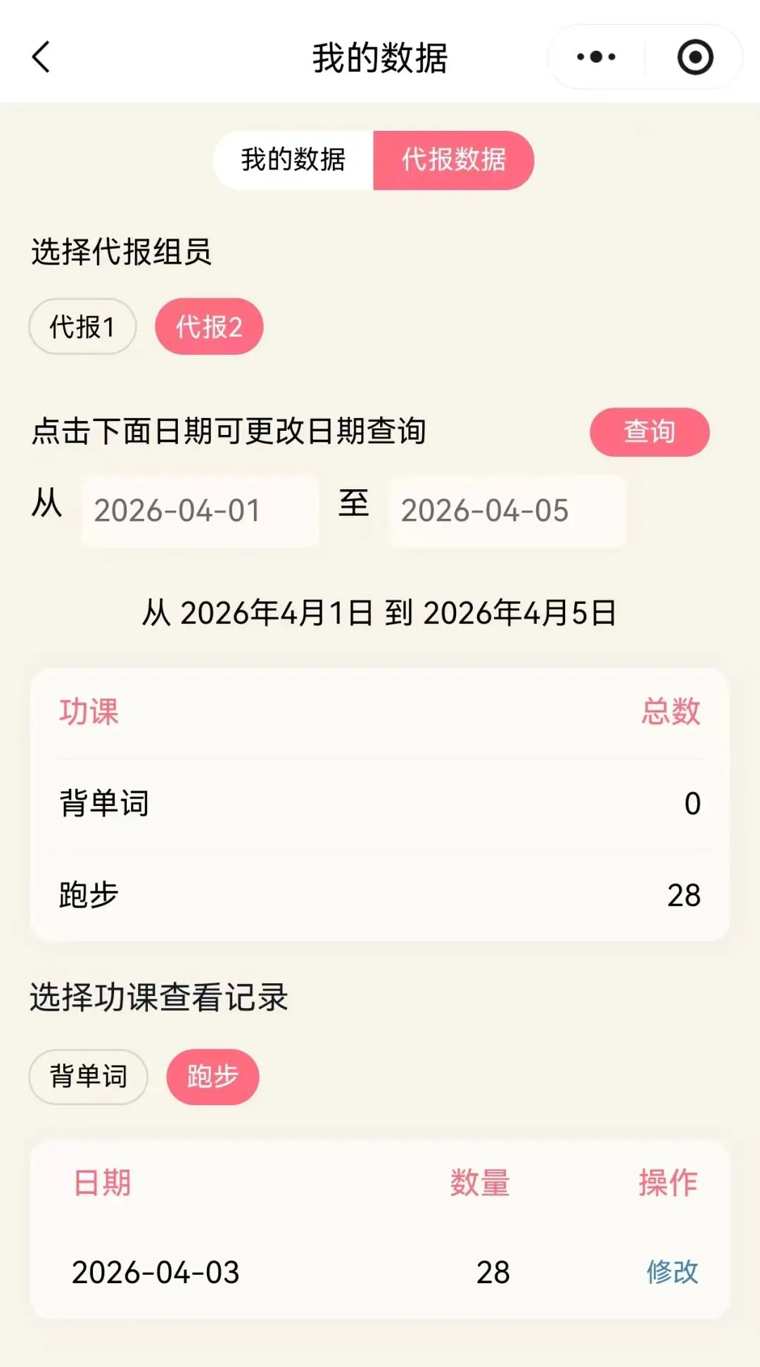 从小组页面里的“我的数据”里,可以查看代报的组员数据。支持按时间段查看各个组员所有功课的整体数据,以及每个功课的详细记录,并支持删除和修改。