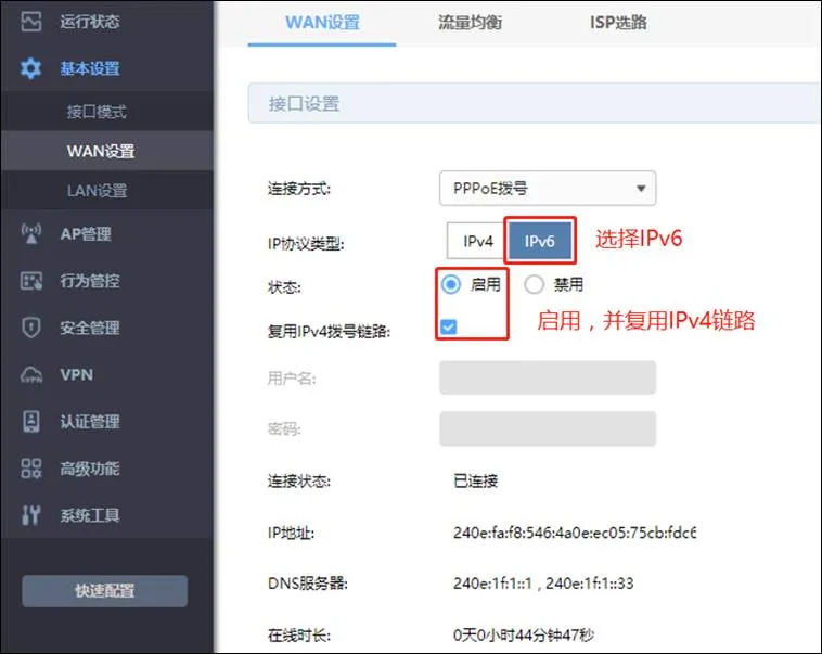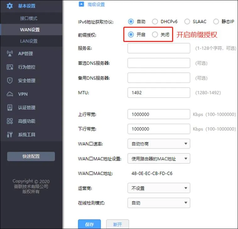 根据运营商提供的IPv6上网方式进行WAN口IPv6设置,并在高级设置中开启前缀授权功能,此处以PPPoE拨号为例(可以复用IPv4的拨号链路),拨号成功后可看到WAN口获取到IPv6地址。
