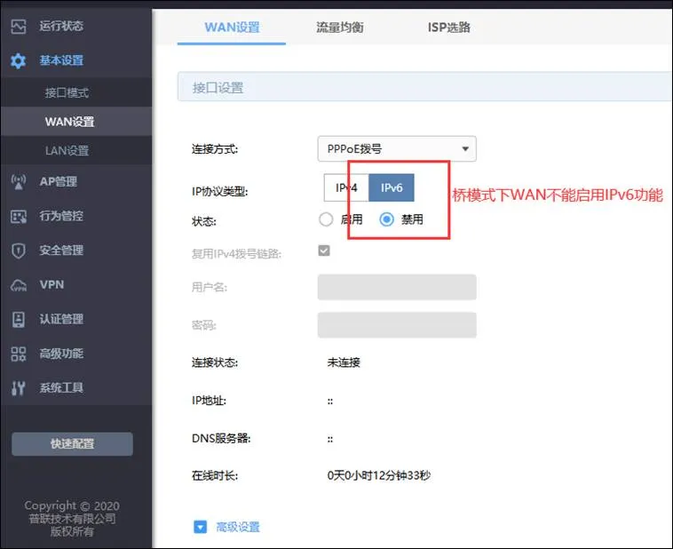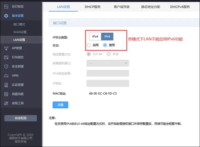 2. 开启桥模式后WAN口和LAN口的IPv6参数均不可设置