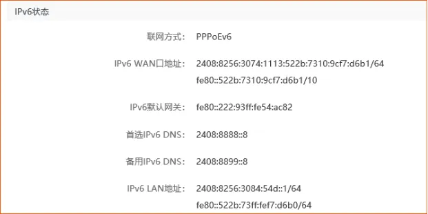 打开“系统管理”—“系统状态”,滚动条拉到最下面,可查看到IPv6状态栏中IPv6获取的地址信息。
