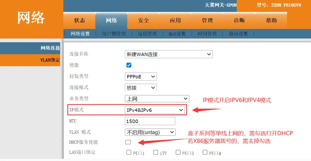 b.修改光猫连接模式改成桥接、IP模式改为“IPV4&IPV6”