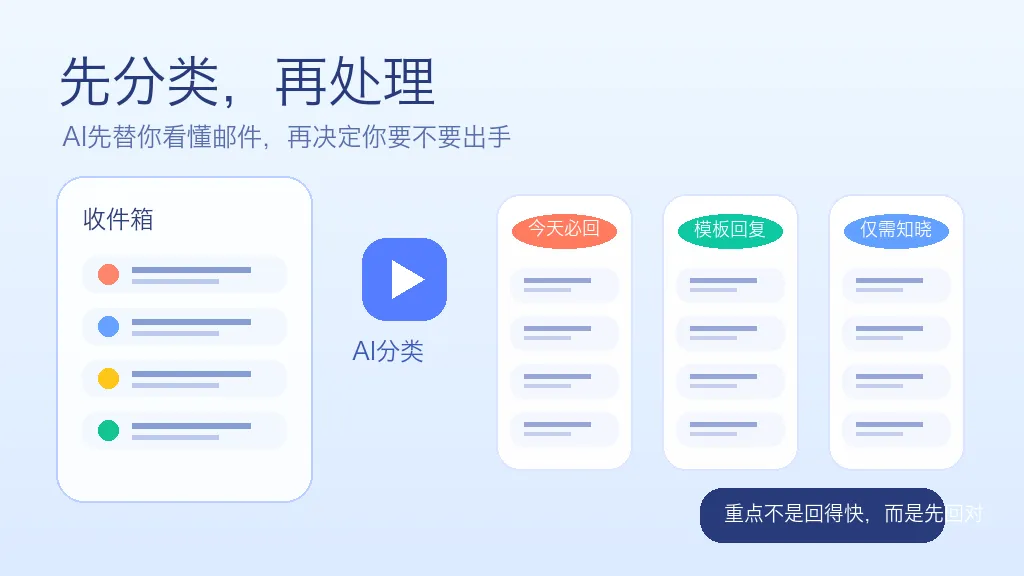 大白话说,很多人处理邮件慢,不是因为打字慢,而是因为每封都要重新判断:这封重不重要,要不要今天回,要不要我亲自回。