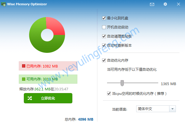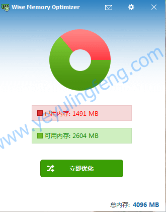 Wise Memory Optimizer自动统计系统总的物理内存,已使用的内存和剩余可用的内存,通过饼图显示出来,你可以一目了然的得知当前内存使用情况。单击“立即优化”按钮,Wise Memory Optimizer将在几秒钟内快速释放被无用程序占用的内存。无论你是电脑新手还是专业用户都能轻松使用。
