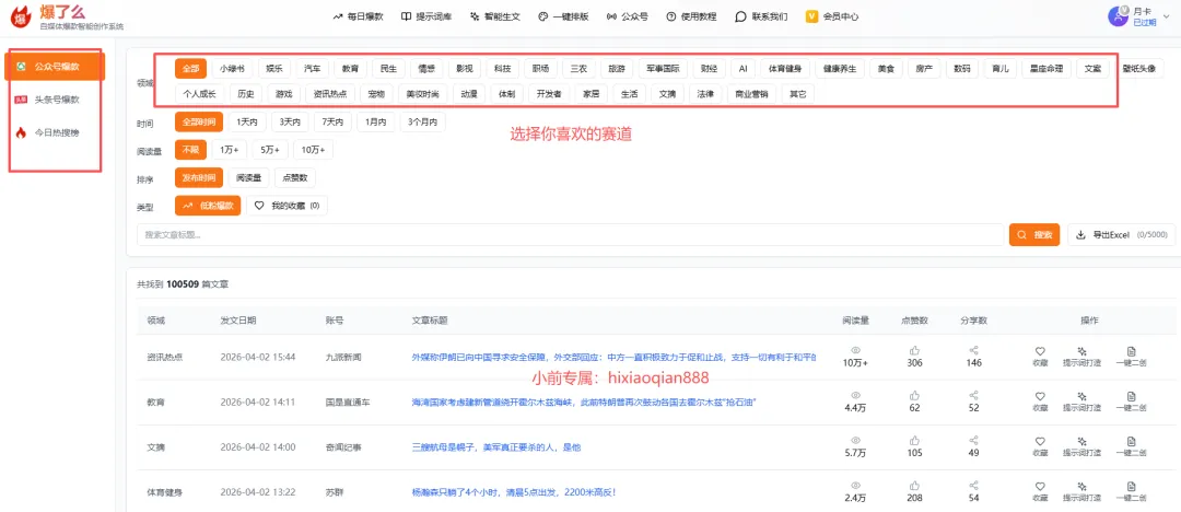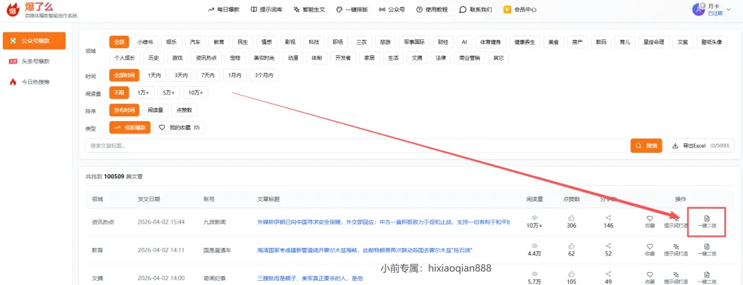 爆了么的逻辑: 它的起点是 “每日爆款”数据库。里面全是实时抓取的、真实爆过的公众号文章(尤其是低粉爆款,证明是内容本身牛)。你是在已经被市场验证过的成功模型基础上进行创作,相当于站在巨人的肩膀上。从“猜用户喜欢什么”变成“直接给用户已经喜欢的”,这是本质区别。