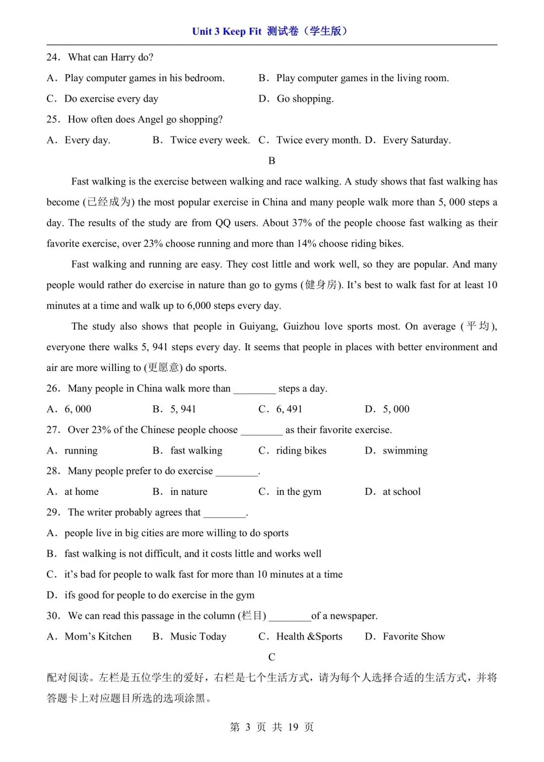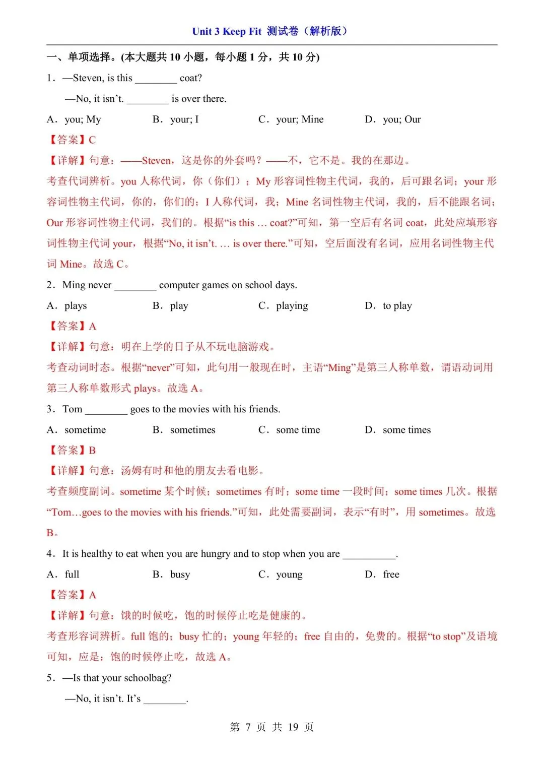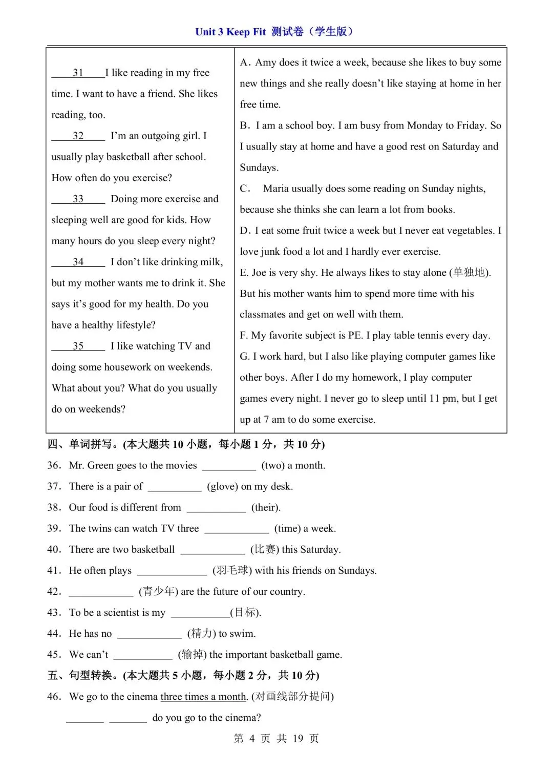 七年级下册人教版英语第三单元测试卷含答案可打印