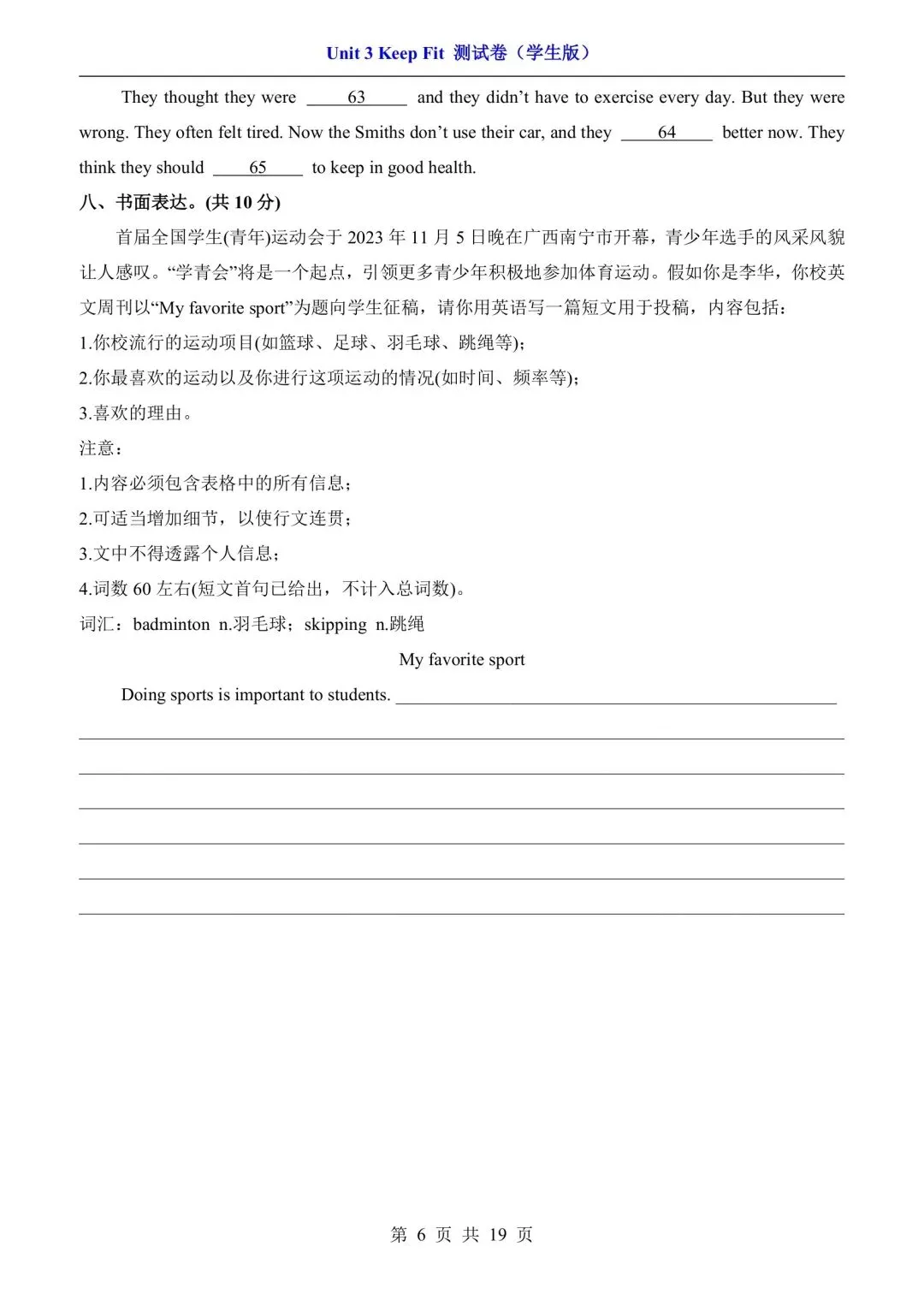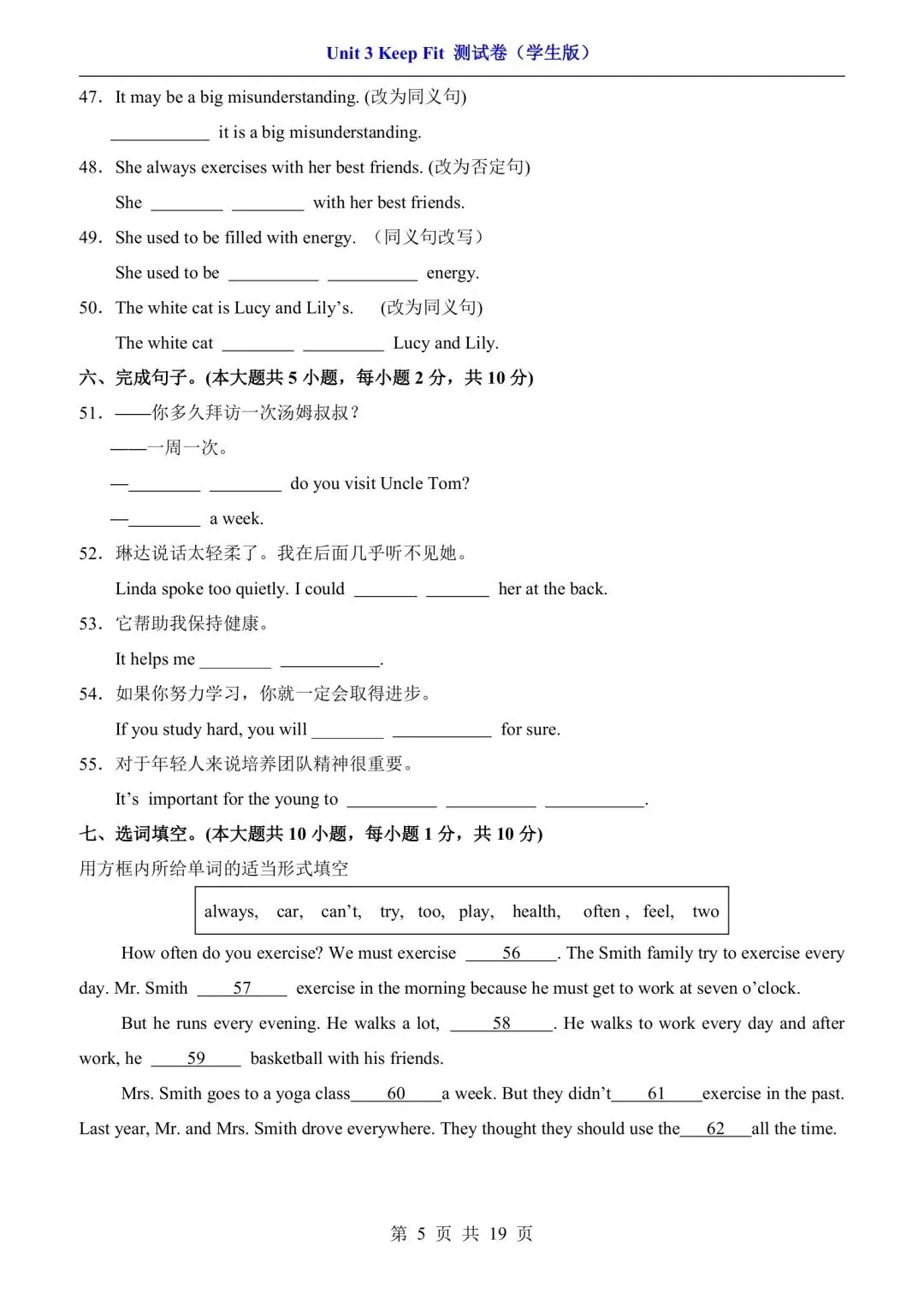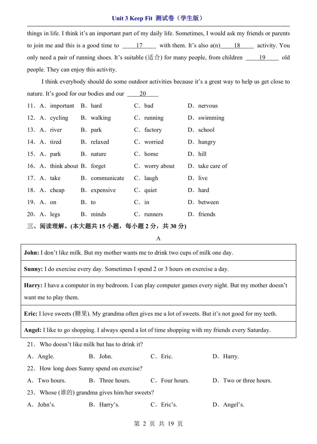 七年级下册人教版英语第三单元测试卷含答案可打印