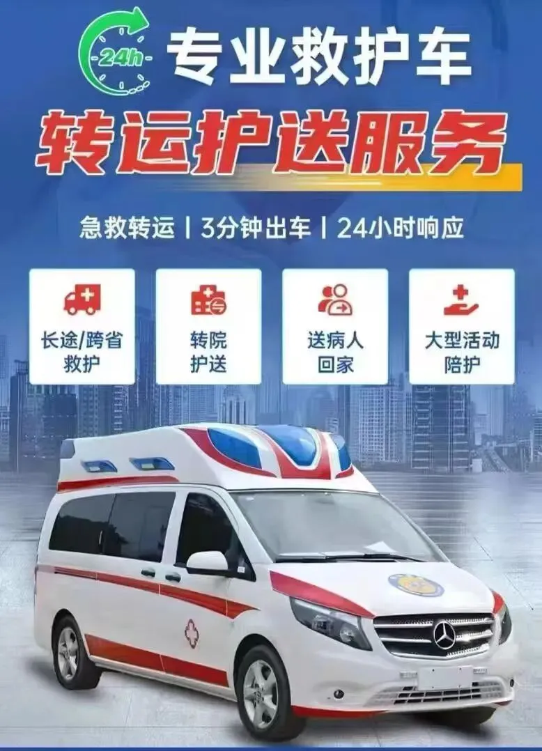 “我们是救护车出租转运公司,120救护车接送病人预约护送。24小时为术后康复、危重患者及跨区域就医人群提供专业医疗转运服务,提供120救护车出租‖救护车转运‖120救护车(非急救)‖跨省长途转运‖危重病人转运‖市内转运‖术后康复病人转运‖高铁病人转运‖患者返乡‖大型活动赛事保障‖配备ICU设备:呼吸机 · 心电监护仪 · 吸痰器 · 微量泵 · 氧气 · 急救药箱 · 专业医护团