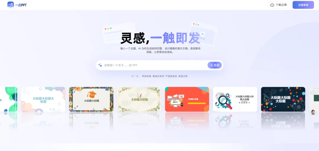 一点 PPT 是专为职场人士打造的 AI 智能 PPT 生成工具,主打 “3 秒开启 PPT 创作” 的极速体验,依托 AI 大模型实现快速大纲生成、智能排版与配色,5 分钟即可输出可直接使用的专业级演示文稿,适配多场景、多行业的 PPT 制作需求。