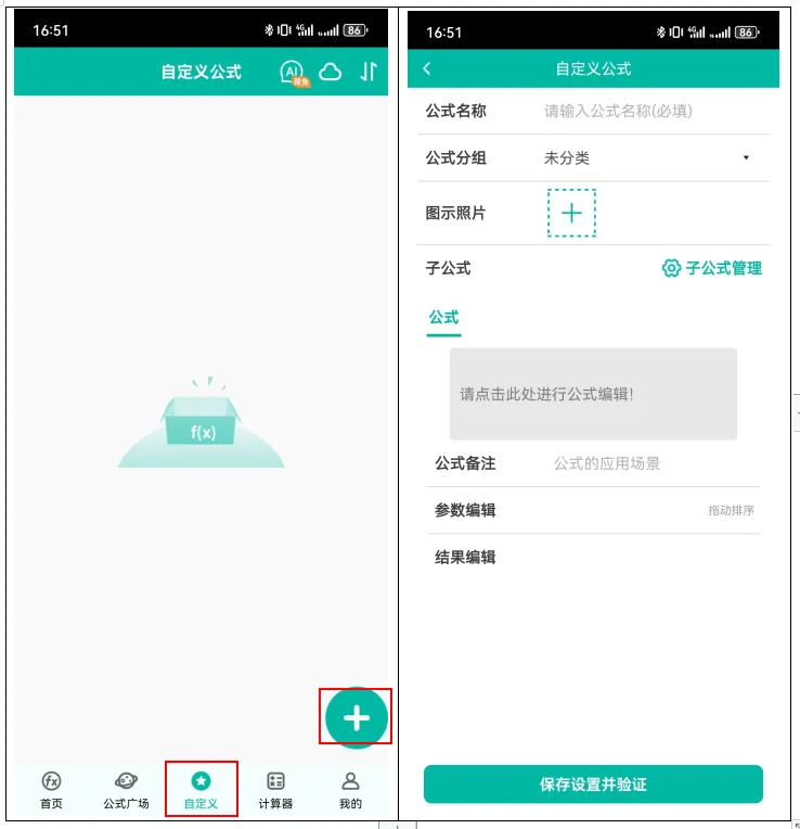 1.进入自定义公式页面(点底部“自定义” → 右侧“+”号)